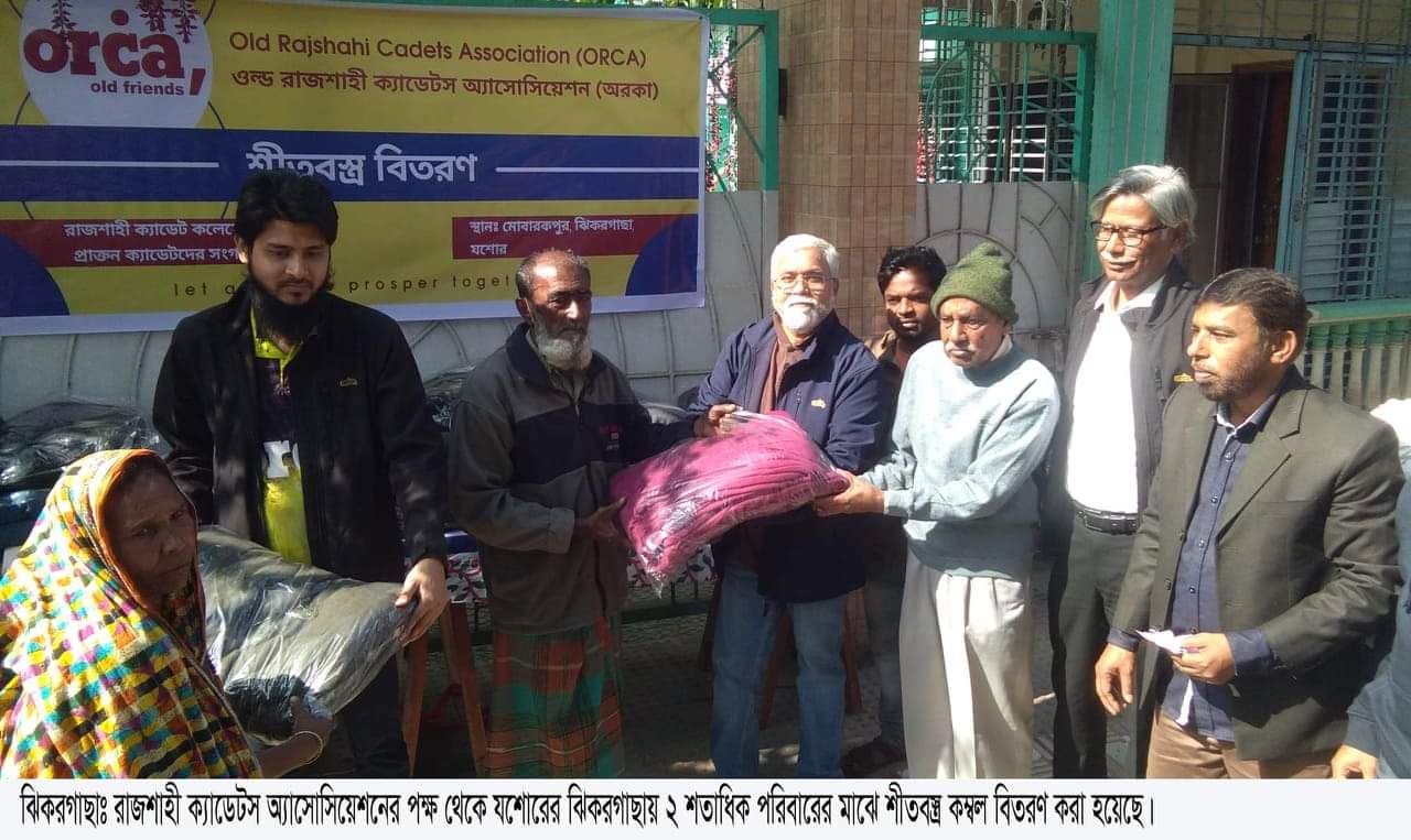 ওল্ড রাজশাহী ক্যাডেট এসোসিয়েশন (অরকা)'র উদ্যোগে সারাদেশের ন্যায় যশোরের ঝিকরগাছাতে ২ শতাধিক দুঃস্থ মহিলা ও বয়স্ক মানুষের মাঝে শীতবস্ত্র কম্বল বিতরণ করা হয়েছে। বুধবার দুপুরে ঝিকরগাছার মোবারকপুরে কম্বল বিতরণ কালে প্রধান অতিথি হিসাবে উপস্থিত ছিলেন, আন্তর্জাতিক খ্যাতিসম্পন্ন সাহিত্যিক হোসেন উদ্দিন হোসেন। বিশেষ অতিথি ছিলেন, ওল্ড রাজশাহী ক্যাডেট এসোসিয়েশন (অরকা)'র সহ-সভাপতি আলমগীর হোসেন, অরকা সদস্য কাজী আবদুর রহমান, অরকা কমিউনিটি উন্নয়ন সম্পাদক মেহেদী হাসান ইমন। সার্বিক সহযোগিতায় ছিলেন, হুমায়ূন কবির, তালিবুল ইসলাম বাসিল, এ্যাডঃ রিফাত জাহাঙ্গীর ও নাজমুস সাকিব।