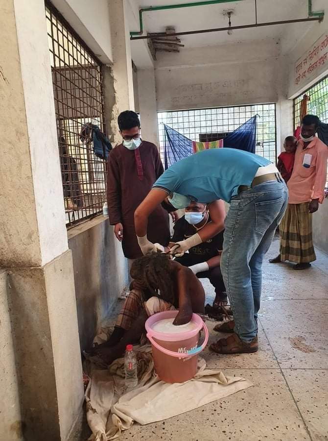 গত ২২ ই অক্টোবর (শুক্রবার) শেরপুর ৩৬০ ডিগ্রি গ্রুপে রাকিব নামের একজনের পোষ্টে তিনি লিখেন একজন অসহায় পাগলের হাতে ঘা হয়ে পোকা ধরেছে তিনি খুবই কষ্টে আছেন। ঐ পোষ্ট দেখে রক্তসৈনিক বাংলাদেশ, গোশাইপুর ইউনিয়ন শাখা'র ম্যানেজম্যান সমন্বয়ক তন্ময় রক্তসৈনিক শ্রীবরদী'র সম্মানিত সভাপতি সাজিদ হাসান শান্তকে মেনশন করে পরে শান্ত বিষয়টা নিয়ে রক্তসৈনিক বাংলাদেশ এর প্রতিষ্ঠাতা পরিচালক আল আমিন রাজু এর সঙ্গে পরামর্শ করে। সে মতে তিনি তন্ময়কে দিকনির্দেশনা দিয়ে রক্তসৈনিক শ্রীবরদী'র সাধারণ সম্পাদক কামরুল হাসান বিদ্যুৎ কে সঙ্গে নিয়ে লোকটিকে খোঁজতে বলেন এবং আল আমিন রাজু এর সঙ্গে যোগাযোগ করার পরামর্শ দেন। ২৩ অক্টোবর ২০২১ (শনিবার) সকালে তারা (তন্ময় ও কামরুল হাসান বিদ্যুৎ) (অসুস্থ পাগল) কে শেরপুর সদর হাসপাতালে খোঁজে পান। খোঁজে পাওয়ার পরপরই আল আমিন রাজু এর সঙ্গে যোগাযোগ করে বিষয়টি অবগত করলে এবং তখন সেই পাগল খাবার খেতে চাইলে প্রথমে তাকে হোটেল থেকে খাবার এনে হাসপাতালের এক স্টাফ এর মাধ্যমে তার খাবার ব্যবস্থা করে। এদিকে বিষয়টি রক্তসৈনিক বাংলাদেশ এর প্রতিষ্ঠাতা পরিচালক আল আমিন রাজু অসুস্থ থাকায় যেতে না পেরে তাদের রক্তসৈনিক পরিবারের এডমিন গ্রুপে বিষয়টি অবগত করেন। তখন তন্ময় রাজুকে জানান রোগীটির জন্য একটি বালতি ও লুঙ্গির প্রয়োজন সেই সাথে তার মাথার চুল গুলো কেটে দেওয়া প্রয়োজন। পাশাপাশি তার সু-চিকিৎসার প্রয়োজন। তখন রক্তসৈনিক পরিবারের পক্ষ হইতে আল আমিন রাজু শেরপুর জেলার মান্যবর জেলা প্রশাসক মোঃ মোমিনুর রশীদ ও শেরপুরের সিভিল সার্জন ডাঃ আব্দুর রউফ মহোদয়ের সঙ্গে যোগাযোগ করলে তাহারা জানান দ্রুত তার (পাগলের) চিকিৎসা ব্যবস্থা করা হবে । এদিকে এ খবর শোনে রক্তসৈনিক শেরপুর এর সদস্য শাকিল মাহমুদ ও জিনিয়া হাসপাতালে ছুটে যান । অন্যদিকে রক্তসৈনিক শেরপুর এর যুগ্ম সাধারন সম্পাদক মোঃ আল আমিন একটি লুঙ্গি ও মশা মারার স্প্রে এর ব্যবস্থা করেন। আল আমিন রাজু মাধ্যমে জুনাইদ ষ্টোর হতে একটি বালটি ও চুল কাটার জন্য সিজার ব্যবস্থা করে দেন। এবং রক্তসৈনিক শেরপুর এর দুযোর্গ ও ত্রাণ বিষয়ক সম্পাদক আশরাফুল ইসলাম এর মাধ্যমে মশারী ও চুল কাটার জন্য হ্যান্ড গ্লাবস ও স্যানিটাইজার এবং একটি রুম স্প্রে এর ব্যবস্থা করেন । নিজ হাতে পাগলের চুল কেটে দেন তন্ময় ও শাকির মাহমুদ পরে রক্তসৈনিক সহযোদ্ধারা মিলে গোসর করিয়ে দেন। রক্তসৈনিক শ্রীবরদী এর সভাপতি সাজিদ হাসান শান্ত বলেন, গোশাইপুর ইউনিয়ন শাখা'র ম্যানেজম্যান সমন্বয়ক তন্ময় ও বিদ্যুৎ এর অক্লান্ত পরিশ্রমের মাধমে (পাগল) রোগীটিকে আমরা খোঁজে পেতে সক্ষম হয়েছি বিধায় তার সেবা করার সুযোগ হয়েছে তাই তিনিও তন্ময় সহ সকলের প্রতি ধন্যবাদ জ্ঞাপন 