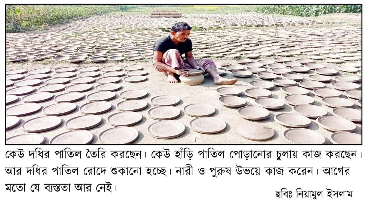 সরেজমিনে গিয়ে দেখা যায়, মৃৎশিল্পীরা কয়েকটি পরিবার এখন বাপ-দাদার এই শিল্পকে টিকিয়ে রেখেছেন। কেউ দধির পাতিল তৈরি করছেন। কেউ হাঁড়ি পাতিল পোড়ানোর চুলায় কাজ করছেন। আর দধির পাতিল রোদে শুকানো হচ্ছে। নারী ও পুরুষ উভয়ে কাজ করেন। আগের মতো যে ব্যস্ততা আর নেই।