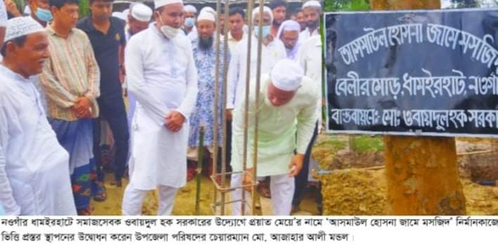 নওগাঁর ধামইরহাটের বিশিষ্ট ব্যবসায়ী ও আওয়ামীলীগ নেতা ওবায়দুল হক সরকারের ছোট মেয়ে প্রয়াত আসমাউল হোসনা (ইতি)র নামে ‘আসমাউল হোসনা জামে মসজিদ’ এর ভিত্তি প্রস্তর স্থাপন করা হয়েছে। শুক্রবার ১ অক্টোবর সকালে উপজেলার মালাহার সড়কের বেলীর মোড়ে ওবায়দুল হক সরকারের উদ্যোগে প্রয়াত মেয়ে আসমাউল হোসনা’র নামে ২য় তলা মসজিদ নির্মাণে ভিত্তি প্রস্তর স্থাপন কাজের শুভ উদ্বোধন করেন উপজেলা পরিষদের চেয়ারম্যান মো. আজাহার আলী মন্ডল। কয়েকটি গ্রামের মুসল্লিরা এ মসজিদে এক সাথে নামাজ আদায় করতে পারবে বলে এমন মহতি কাজের জন্য উপজেলা আওয়ামীলীগের সাধারণ সম্পাদক মো. শহীদুল ইসলাম, ধামইরহাট পৌরসভার মেয়র মো.আমিনুর রহমান, প্যানেল মেয়র মুক্তাদিরুল হক (মুক্তা) ওবাদুল হক সরকারের ভুয়সী প্রংশা করেন। উদ্বোধনী অনুষ্ঠানে আরো উপস্থিত ছিলেন, আমেরিকার মাটিতে চিরসায়িত প্রয়াত আসমাউল হোসনার ভগ্নিপতি ও উপজেলা যুবলীগ সভাপতি জাবিদ হোসেন মৃদু, বড় ও মেজ ভাই সেতু, সুমন, স্থানীয় কাউন্সিলর একরামুল হকসহ বিভিন্ন শ্রেণি পেশার মানুষ। উদ্বোধনী অনুষ্ঠানে আমেরিকা প্রবাসী প্রয়াত ইতি'র জন্য পরকালের সর্বচ্ছো শান্তির মোকাম দান ও সুষ্ঠু ভাবে মসজিদটি নির্মাণ কল্পে দোয়া পাঠ করেন উত্তরবঙ্গের পীরে কেবলা চকভারুনিয়া শাহসুফি কোরবান আলী হুজুরের নাতি জামাই মাওলানা আব্দুস সালাম। সমাজসেবক ওবায়দুল হক সরকার জানান, আমেরিকা প্রবাসী আমার ছোট মেয়ে আসমাউল হোসনা (ইতি) কিছুদিন পূর্বে আমেরিকাতেই পরলোক গমন ও ওই খানেই দাফন-কাফন সম্পর্ন করা হয়। আমার মেয়ের মাগফিরাত কামনা করে মহান আল্লাহর ওয়াস্তে দ্বিতীয় তলা বিশিষ্ট এই মসজিদ নির্মাণের সমুদয় অর্থ আমি প্রদান করবো। মুসল্লিবৃন্দ নামাজে আল্লাহ’র ইবাদত করতে পারবেন, এ সময় তিনি তার প্রয়াত মেয়ের জন্য সকলের নিকট দোয়া কামনা করেন।