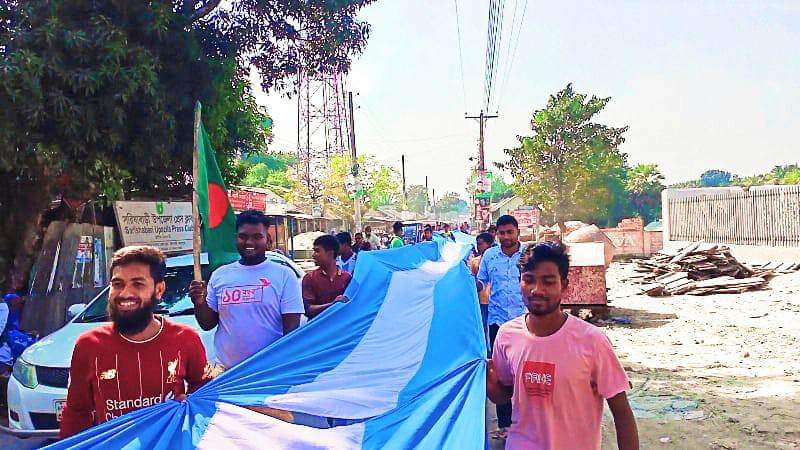 পরে দুপুর থেকে বিকেল পর্যন্ত ট্রাক পরিবহন মোড় থেকে পৌরসভা হয়ে পশু হাসপাতাল হয়ে রাস্তা জুড়ে ১০৬০ ফুটের বিশাল আকৃতির এই পতাকা টাঙানো হয়।