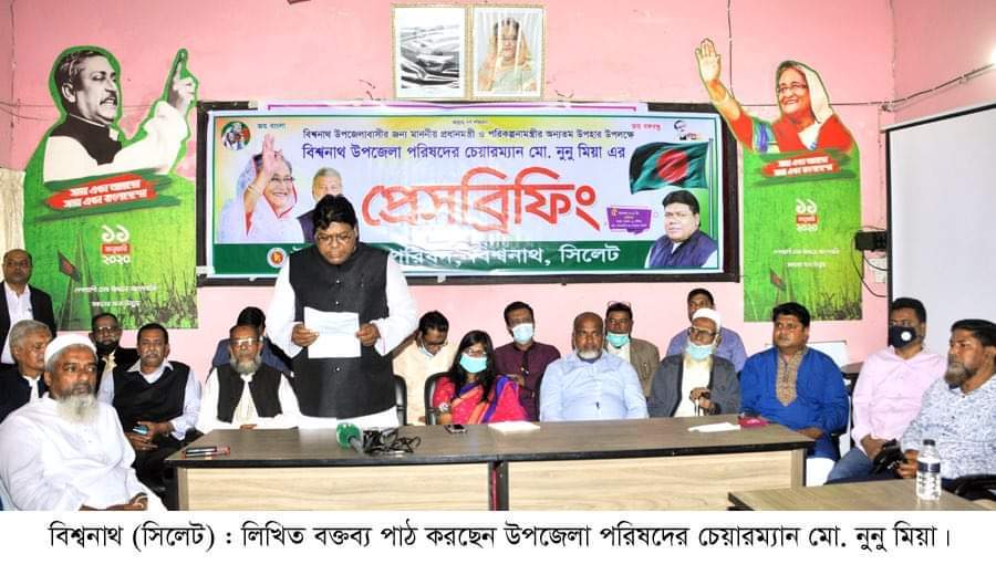 প্রেস বিফিংয়ে লিখিত বক্তব্য পাঠ করেন উপজেলা পরিষদের চেয়ারম্যান ও জেলা আওয়ামী লীগের উপদেষ্টা মন্ডলীর সদস্য এস এম নুনু মিয়া।