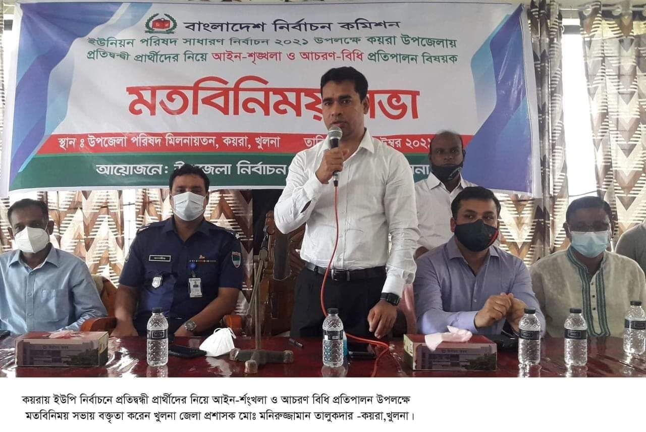 খুলনা জেলা প্রশাসক মোঃ মনিরুজ্জামান তালুকদার বলেছেন, সরকারের ভাবমুর্তি অক্ষুন্ন রাখতে আগামী ইউপি নির্বাচন হবে অবাধ সুষ্ঠু ও নিরপেক্ষ। কেউ প্রভাব খাটানোর চেষ্টা করলে তাদের বিরুদ্ধে কঠোর ব্যবস্থা গ্রহণ করা হবে। নির্বাচনে বিশৃঙ্খলা সৃষ্টি করার চেষ্টা করা হলে তাদের কোন ছাড় দেয়া হবেনা।
