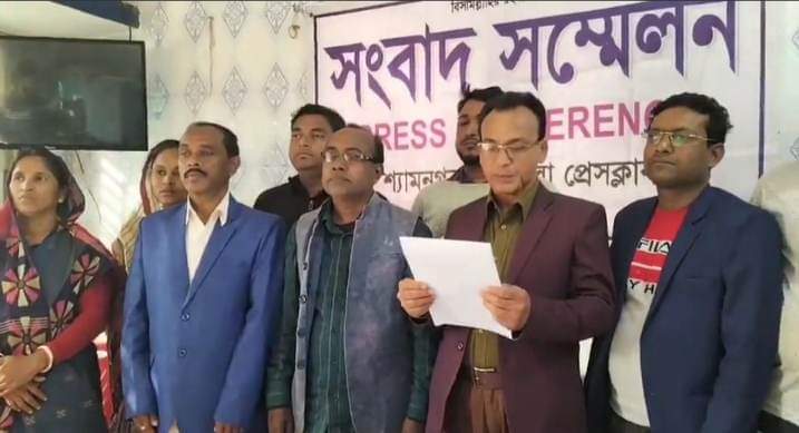 ছবি- শ্যামনগর উপজেলা প্রেসক্লাবে সংবাদ সম্মেলনে লিখিত বক্তব্য পাঠ করছেন চেয়ারম্যান অসীম মৃধা।