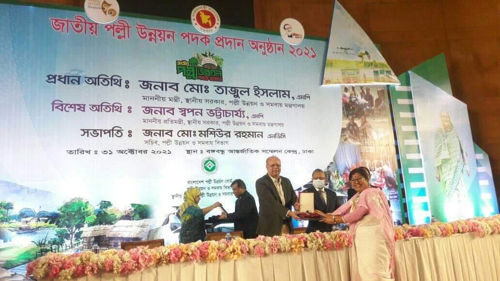 ৩১ অক্টোবর রবিবার বঙ্গবন্ধু আন্তর্জাতিক সম্মেলন কেন্দ্র (বিআইসিসি) আগারগাঁও ঢাকায় প্রধান অতিথি হিসাবে স্বর্ণপদক সহ সম্মননাপত্র তুলে দেন স্থানীয় সরকার পল্লী উন্নয়ন ও সমবায় মন্ত্রনালয়ের মন্ত্রী মোঃ তাজুল ইসলাম এমপি। অনুষ্ঠানে বিশেষ অতিথির বক্তব্য রাখেন- স্থানীয় সরকার পল্লী উন্নয়ন ও সমবায় মন্ত্রনালয়ের প্রতিমন্ত্রী স্বপন ভট্টাচার্য্য এমপি। স্বাগত ভাষণ দেন বাংলাদেশ পল্লী উন্নয়ন বোর্ডের মহাপরিচালক সুপ্রিয় কুমার কুন্ডু।