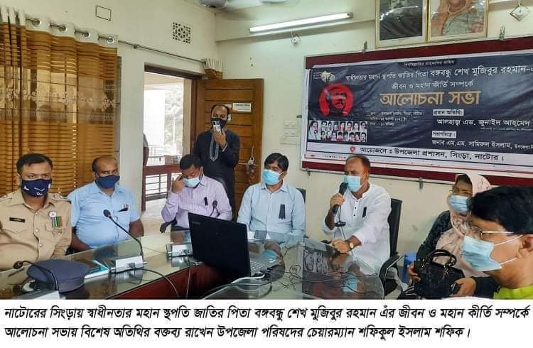পরে সকাল ১১টায় উপজেলা পরিষদ হলরুমে উপজেলা ও পৌর আওয়ামীলীগের আয়োজনে জাতীয় শোক দিবসের আলোচনা ও দোয়ার অনুষ্ঠানে ভার্চুয়ালে প্রধান অতিথির বক্তব্য রাখেন তথ্য ও যোগাযোগ প্রযুক্তি প্রতিমন্ত্রী এড. জুনাইদ আহমে পলক এমপি। উপজেলা আওয়ামী লীগের সভাপতি এড. ওহিদুর রহমান শেখ এর সভাপতিত্বে বিশেষ অতিথি হিসেবে বক্তব্য রাখেন পৌর মেয়র ও পৌর আওয়ামী লীগের সাধারণ সম্পাদক জান্নাতুল ফেরদৌস, উপজেলা পরিষদের ভাইস চেয়ারম্যান কামরুল হাসান, শামীমা হক, উপজেলা আওয়ামী লীগের সহ-সভাপতি নবীর উদ্দিন, আব্দুল ওয়াদুদ মোল্লা। এসময় উপস্থিত ছিলেন উপজেলা আওয়ামী লীগের জনস্বাস্থ্য বিষয়ক সম্পাদক সরফরাজ নেওয়াজ বাবু, পৌর আ’লীগের সহ-সভাপতি মাহাবুব আলম বাবু, উপজেলা যুবলীগের সভাপতি শরিফুল ইসলাম, পৌর যুবলীগের সভাপতি সোহেল তালুকদার, জেলা পরিষদের সদস্য সালাহউদ্দিন আল আজাদ, সাজ্জাদ হোসেন, ছাত্রলীগের সভাপতি খালিদ হাসান, সাধারণ সম্পাদক নাজমুল হক, সিংড়া জিএ কলেজের ভিপি সজিব ইসলাম জুয়েল, পৌরসভার প্যানেল মেয়র সঞ্জয় সাহা প্রমুখ। পরে তারা প্রায় আড়াই হাজার পথচারীদের মাঝে খাবার বিতরণ করেন।