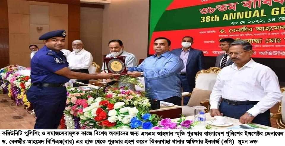 কমিউনিটি পুলিশিং ও সমাজসেবামূলক কাজে বিশেষ অবদানের স্বীকৃতি স্বরূপ বাংলাদেশ অবসরপ্রাপ্ত পুলিশ অফিসার্স কল্যাণ সমিতি কতৃর্ক বাষিক সাধারণ সভার অনুষ্ঠানে “এসএম আহসান স্মৃতি পুরস্কার” হিসেবে ক্রেস ও নগদ অর্থ উপহার পেয়েছেন যশোরের ঝিকরগাছা থানার অফিসার ইনচার্জ (ওসি) সুমন ভক্ত। তিনি ঝিকরগাছা থানাতে যোগদানের পূর্বে যশোর কোতয়ালী মডেল থানায় পুলিশ পরিদর্শক (ইন্টেলিজেন্স অ্যান্ড কমিউনিটি পুলিশিং) হিসেব কর্মরত থাকাকালীন সময়ে এলাকার জনগণের সাথে পুলিশের সুসম্পর্ক বৃদ্ধি, এলাকার জনগণ দ্বারা শহরের প্রায় বেশিরভাগ অংশ রাত্রিকালীন পাহারা দেয়ার মাধ্যমে চুরি-ছিনতাই, মাদক ব্যবসা প্রতিরোধ করন, করোনাকালীন সময়ে কমিউনিটি পুলিশিং এর মাধ্যমে কোয়ারেন্টাইন, অহেতুক বাসা থেকে বের না হওয়া ও সামাজিক দূরত্ব মানার জন্য জনগণকে সচেতন করে তোলা, গুজব বিরোধী, যৌতুক ও নারী নির্যাতন প্রতিরোধে জনসচেতনতা বৃদ্ধির মাধ্যমে অপরাধ প্রতিরোধে কাজ করায় এই পুরস্কার অর্জন করতে সক্ষম হয়েছেন। এ জন্য শনিবার (২৮ মে) বাংলাদেশ পুলিশের ইন্সপেক্টর জেনারেল ড. বেনজীর আহমেদ বিপিএম(বার) এর হাত থেকে পুরস্কার গ্রহণ করেন।