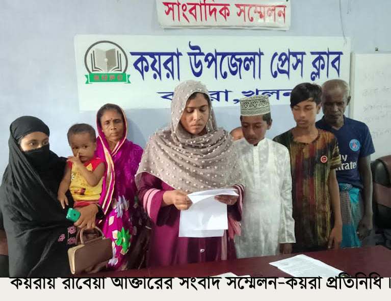 কয়রায় মিথ্যা সংবাদ সম্মেলন ও মানববন্ধনের প্রতিবাদে পাল্টা সংবাদ সম্মেলন করেছেন উপজেলার ২নং কয়রা গ্রামের মোঃ শেহের আলী ঢালীর কন্যা রাবেয়া আক্তার।