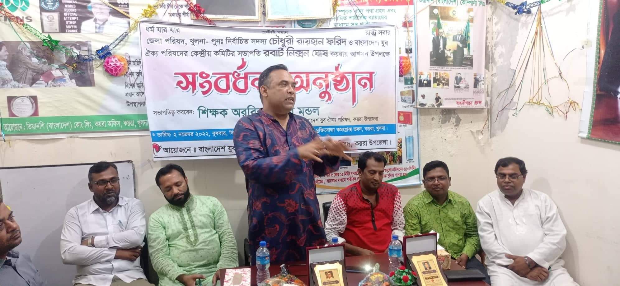 গত ২রা নভেম্বর, বুধবার সন্ধ্যা ৬টায় উপজেলা মুক্তিযোদ্ধা কমপ্লেক্স ভবনে সংগঠনের অস্থায়ী কার্যালয়ে উপজেলা যুব ঐক্য পরিষদের সভাপতি শিক্ষক অরবিন্দ কুমার মণ্ডলের সভাপতিত্বে ও সহ-সভাপতি কার্তিক কুমার বিবেকের সঞ্চালনায় সংবর্ধনা অনুষ্ঠানে প্রধান অতিথি হিসেবে উপস্থিত থেকে বক্তব্য রাখেন, পূর্ণ: নির্বাচিত জেলা পরিষদ সদস্য, সাবেক প্যানেল চেয়ারম্যান ও জেলা যুব লীগ নেতা চৌধুরী রায়হান ফরিদ, বিশেষ অতিথি হিসেবে উপস্থিত থেকে বক্তব্য রাখেন, বাংলাদেশ যুব ঐক্য পরিষদের কেন্দ্রীয় কমিটির সভাপতি ও জেলা আওয়ামীলীগের সদস্য রবার্ট নিক্সন ঘোষ, জেলা যুব ঐক্য পরিষদের ভারপ্রাপ্ত সভাপতি স্বপন কুমার রায় ও জেলা পরিষদ খুলনা- ২ থেকে নবনির্বাচিত সদস্য, সাবেক ইউপি চেয়ারম্যান ও উপজেলা যুবলীগ নেতা জিএম আবদুল্লাহ আল মামুন লাভলু।