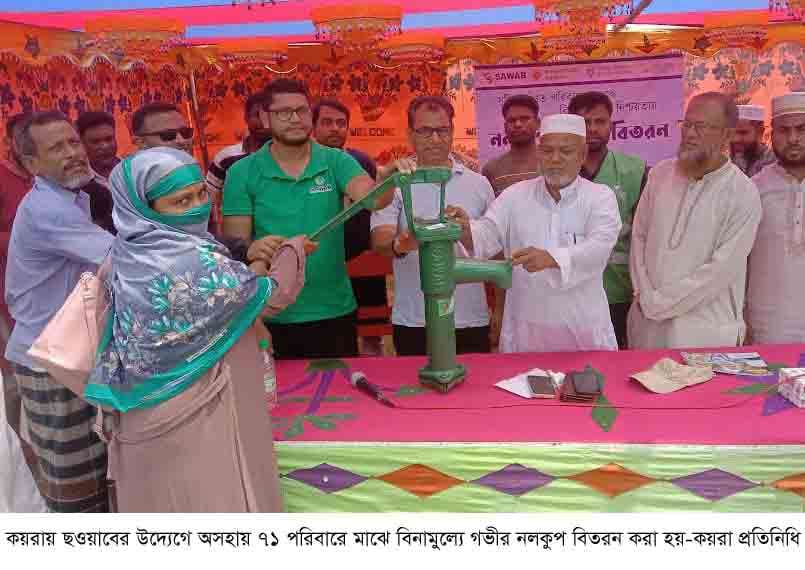 কয়রা উপজেলর সুবিধা বঞ্চিত পরিবারের মাঝে বিশুদ্ধ পানির নিশ্চয়তায় গভীর নলকুপ বিতরণ করা হয়েছে। বে-সরকারী সংস্থা ছওয়াবের সার্বিক সহযোগীতায় উপজেলার ৭ টি ইউনিয়নের প্রত্যেক জনপদের ৭১ পরিবারের মাঝে এ সকল নলকুপ বিতরণ করা হয়।