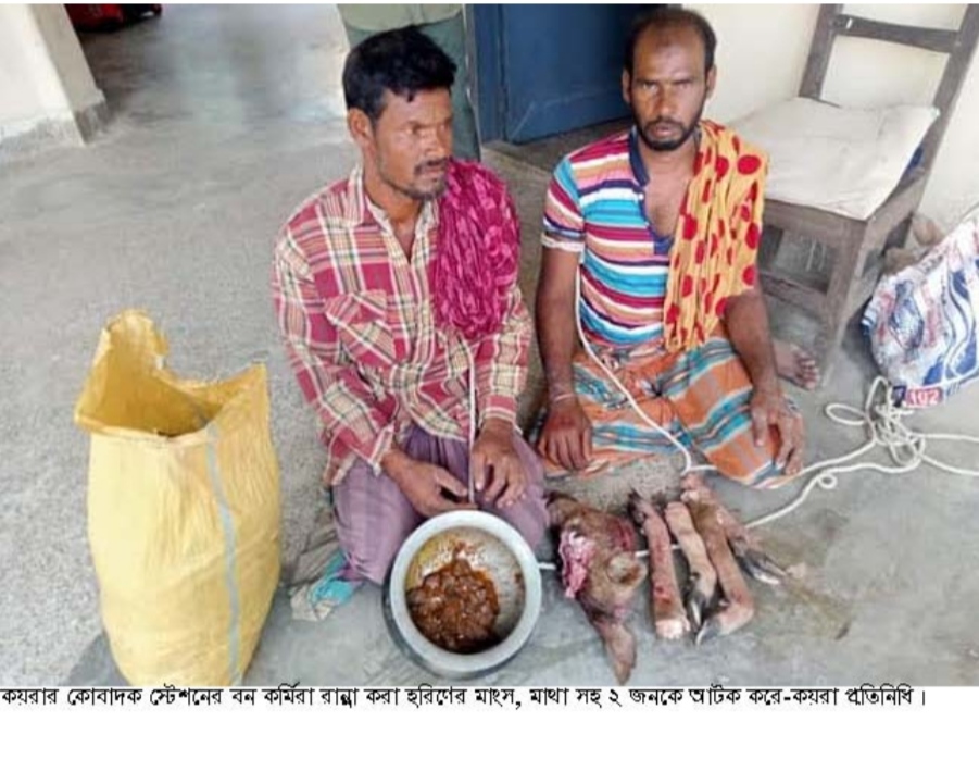 কয়রা উপজেলার কোবাদক স্টেশনের বন কর্মীরা অভিযান চালিয়ে রান্না করা হরিণের মাংস, ১টি মাথা, ৪টি পা সহ ২ জনকে আটক করেছে। এ সময় তাদের নিকট থেকে ৩টি নৌকা জব্দ করা হয়।