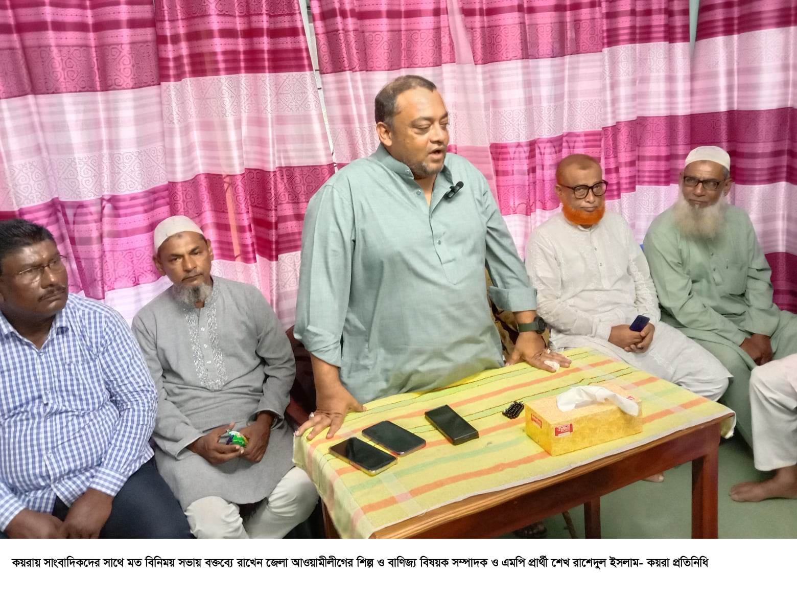 কয়রায় কর্মরত সাংবাদিকদের সাথে মতবিনিময় সভা করেছেন খুলনা-৬ (কয়রা-পাইকগাছা) আসনে আওয়ামী লীগের দলীয় মনোনয়ন প্রত্যাশী প্রয়াত সাংসদ শেখ নুরুল হকের ছেলে আলহাজ্ব শেখ রাশেদুল ইসলাম।