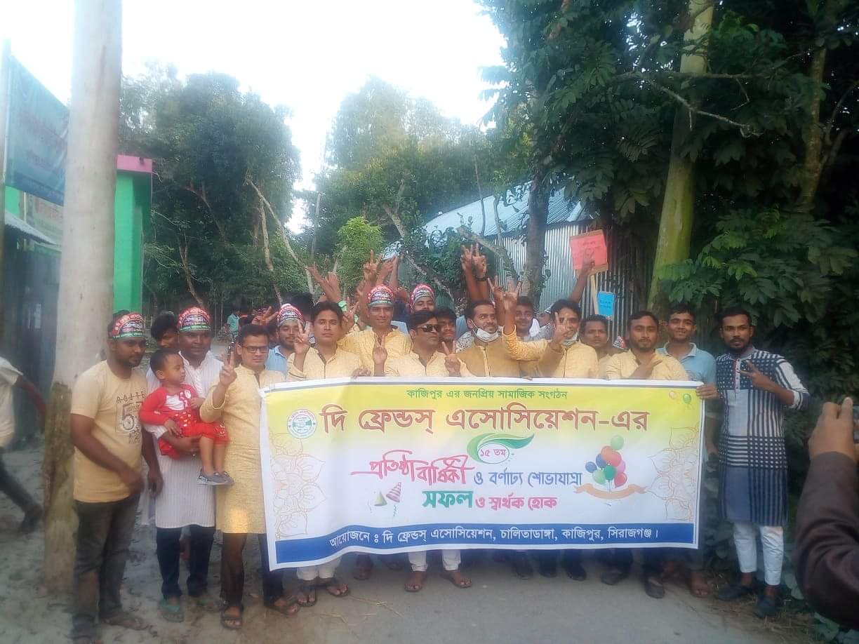 সিরাজগঞ্জের কাজিপুরে দি ফ্রেন্ডস্ এসোসিয়েশন সামাজিক সংগঠন এর ১৫ তম প্রতিষ্ঠা বার্ষিকী পালিত হয়েছে । ২৬ই নভেম্বর এ দিবস উপলক্ষে বাদ জুমা একটি বর্ণাঢ্যশোভাযাত্রা অত্র সংগঠনের কার্যালয় চালিতাডাংগা থেকে শুরু করে চালিতাডাংগা বাজার প্রদক্ষিণ শেষে কার্যালয় চত্বরে এসে সমবেত হয়। উক্ত শোভাযাত্রার অংশ নেন সংগঠনের সভাপতি মোঃ হামিদুর রহমান সবুজ , সাধারণ সম্পাদক শরিফুল ইসলাম, সহসভাপতি কামাল পাশা, সাবেক সভাপতি সাজেদুল করিম স্বপন,সাংগঠনিক সম্পাদক মোতালেব হোসেন সহ সংগঠনের সকল সদস্য বৃন্দ ও এলাকার সুশীল সমাজের এক অংশ। পরে কার্যালয় চত্বরে অত্র প্রতিষ্ঠানের সভাপতি হামিদুর রহমান সবুজের সভাপতিত্বে এক আলোচনা সভায় প্রধান অতিথি হিসেবে বক্তব্য রাখেন উপজেলা চেয়ারম্যান খলিলুর রহমান সিরাজী। এ সময় তিনি বলেন, দি ফ্রেন্ডস্ এসোসিয়েশন সংগঠনটি দীর্ঘদিন ধরে সামাজিক উন্নয়নের পাশাপাশি মেধাবী ও দরিদ্র শিক্ষার্থীদের লেখা পড়ার পথ সুগম করতে প্রতি বছর বিভিন্ন উদ্যোগ গ্রহন তথা আর্থিকভাবে সহযোগিতার হাত বাড়িয়ে দিয়ে দৃষ্টান্ত স্থাপন করেছে।করোনাকালে দরিদ্র পরিবারের পাশে দাঁড়িয়েছেন। এলাকার বিভিন্ন আর্থ- সামাজিক উন্নয়ন ও শিক্ষা ক্ষেত্রে ভুমিকা রাখছে। আমি সংগঠনের উত্তরোত্তর সাফল্য কামনা করছি। অত্র সংগঠনের প্রচার সম্পাদক সেলিম রেজার পরিচালনায় বিশেষ অতিথি হিসেবে বক্তব্য রাখেন চালিতাডাংগা ইউনিয়নের চেয়ারম্যান আতিকুর রহমান মুকুল, অত্র সংগঠনের উপদেষ্টা সদস্য রোকনুজ্জামান মিল্টন, অত্র প্রতিষ্ঠানের উপদেষ্ঠা ও চালিতাডাংগা মোহাম্মদ নাসিম মহিলা ডিগ্রি কলেজের অধ্যক্ষ আলহাজ্ব ফজলুল হক। আরও বক্তব্য রাখেন অত সংগঠনের সাধারণ সম্পাদক শরিফুল ইসলাম, সাবেক সভাপতি সাজেদুল করিম স্বপন, চালিতাডাংগা ইউনিয়ন আঃলীগের সভাপতি আব্দুল মজিদ বাদশা তালুকদার, উপদেষ্টা আব্দুর রাজ্জাক প্রমুখ।এ সময় উপস্থিত ছিলেন অত্রপ্রতিষ্ঠানের উপদেষ্টা সদস্য শফিকুল ইসলাম সাংবাদিক , চালিতাডাংগা ইউনিয়ন আঃলীগের সাংগঠনিক সম্পাদক শাহিন আলম, উপজেলা স্বেচ্ছাসেবক লীগের সাধারণ সম্পাদক আমিনুল ইসলাম সহ অন্যান্য সদস্য বৃন্দ। পরে ১৫ তম প্রতিষ্ঠা বার্ষিকী উপলক্ষে কেক কেটে শুভেচ্ছা জানান ও সংগঠনের উত্তরোত্তর উৎকর্ষ ও উন্নতি কামনা করেন প্রধান অতিথি খলিলুর রহমান সিরাজী।উল্লেখ যে অত্র প্রতিষ্ঠানের প্রধান উপদেষ্টা সিরাজগঞ্জ -১ কাজিপুর সাংসদ প্রকৌশলী তানভীর শাকিল জয় সার্বক্ষনিক প্রতিষ্ঠানটি দেখভাল করছেন।