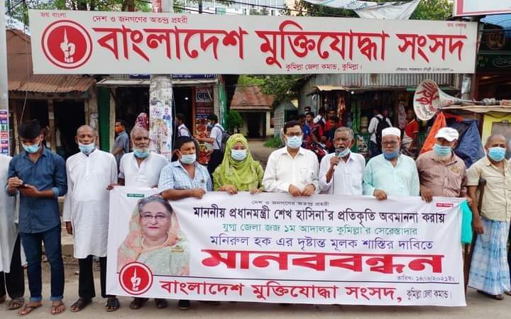 কুমিল্লা যুগ্ম জেলা জজ ১ম আদালতের সেরেস্তাদার মনিরুল হকের অফিস কক্ষে গণপ্রজাতন্ত্রী বাংলাদেশ সরকারের মাননীয় প্রধানমন্ত্রী শেখ হাসিনার প্রতিকৃতি অবমাননা করার ঘটনা ঘটেছে। সংশ্লিষ্ট সূত্রে জানা গেছে, ২৪শে আগষ্ট কুমিল্লা যুগ্ম জেলা জজ ১ম আদালতের সেরেস্তাদার মনিরুল হক মাননীয় প্রধানমন্ত্রী শেখ হাসিনা ও জাতির জনক বঙ্গবন্ধু শেখ মুজিবুর রহমানের প্রতিকৃতিকে অসম্মান করার তথ্য প্রমানের চিত্র পাওয়া গেছে। কুমিল্লা আদালতের সেরেস্তাদার মনিরুল হক বাংলাদেশ সরকারের মাননীয় প্রধানমন্ত্রী শেখ হাসিনার প্রতিকৃতি যথাযথ স্থানে তথা দেয়ালের উপরে না লাগিয়ে রাষ্ট্র প্রধান শেখ হাসিনার ছবি বই পুস্তক ও পেপার দিয়ে ঢেকে স্টিলের আলমারির উপরে প্রর্দশন করে থাকে। যাহা বাংলাদেশ সংবিধানের ৪(ক) এর পরিপন্থি মূলক কর্মকান্ড। উক্ত ঘটনার প্রতিবাদ ও স্বাধীনতা বিরোধী অভিযুক্ত মনিরুল হককে আইনের আওতায় এনে চাকরির সকল সকল সুযোগ সুবিধা স্থগিত করার দাবিতে মঙ্গলবার সকালে কুমিল্লা নগরীর ছাতিপট্টি এলাকায় বাংলাদেশ মুক্তিযোদ্ধা সংসদ কুমিল্লা জেলা কমান্ড ইউনিট কর্তৃক মানববন্ধন করা হয়। উক্ত মানববন্ধনে উপস্থিত থাকেন-বাংলাদেশ মুক্তিযোদ্ধা সংসদ কুমিল্লা জেলা কমান্ড ইউনিটের কমান্ডার বীরমুক্তিযোদ্ধা সফিউল আহমেদ বাবুল। এতে অন্যান্য বীরমুক্তিযোদ্ধাদের মাঝে উপস্থিত ছিলেন-কুমিল্লা জেলা কমান্ড ইউনিটের সহকারী কমান্ডার জাহিদ হাসান, সহকারী কমান্ডার ফজলুর রহমান, কোতয়ালী থানা কমান্ড ইউনিটের সাবেক কমান্ডার মোতাহের হোসেন বাবুল, কোতয়ালী থানা কমান্ডার শাহজাহান সাজু, সহকারী কমান্ডার এ,কে,এম আজিজুল বাশার সেলিম, সহকারী কমান্ডার সুলতান আহম্মেদ, সদস্য গোলাম হোসেন চৌধূরীসহ বীরমুক্তিযোদ্ধাগণ, শহীদ ও বীরমুক্তিযোদ্ধা পরিবারের সদস্যবৃন্দ। মানবন্ধনে বীরমুক্তিযোদ্ধারা বলেন-স্বাধীনতা বিরোধী কর্মকান্ড ঘটিয়েছে যুগ্ম জেলা জজ ১ম আদালতের কর্মচারী সেরেস্তাদার মনিরুল হক। মাননীয় প্রধানমন্ত্রী শেখ হাসিনার ছবি যথাযথ সম্মান স্থানে না লাগিয়ে পেপার বই দিয়ে ঢেকে রেখে অবমাননা করা রাষ্ট্রের ষড়যন্ত্র লিপ্ত হওয়া। বাংলাদেশ মুক্তিযোদ্ধা সংসদ,কুমিল্লা জেলা কমান্ড ইউনিটের পক্ষ থেকে তীব্র নিন্দা প্রতিবাদ জানাই। এ ধরনের রাষ্ট্র বিরোধী কার্যকলাপকারী অভিযুক্ত সেরেস্তাদারকে অবিলম্বে গ্রেফতার ও চাকরিচ্যুতসহ সকল আইনগত ব্যবস্থা প্রশাসনকে নিতে হবে।
