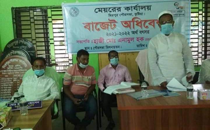 কুষ্টিয়ার মিরপুর পৌরসভায় ২০২১-২০২২ অর্থ বছরের বাজেট ঘোষনা করা হয়েছে। বুধবার সকাল ১১টায় পৌর মিলনায়তনে মেয়র হাজী মোঃ এনামুল হক ১২ কোটি ৪৩ লক্ষ ৫৯ হাজার ৪শ’ ৮৫ টাকার বাজেট উপস্থাপন করেন। বাজেটে উন্নয়ন খাতে আয় ধরা হয়েছে ৮ কোটি ০৮ লক্ষ ৩০ হাজার টাকা। প্রারম্ভিক উদ্বৃত্ত ৫৪ লক্ষ ২৫ হাজার ৭শ’ ২২ টাকা। বাজেটে উন্নয়ন খাতে ব্যয় ধরা হয়েছে ৮ কোটি ৪৩ লক্ষ ৩০ হাজার টাকা। বাজেটে ট্যাক্স, রেইট, ফিস ও অন্যান্য রাজস্ব খাতে আয় ধরা হয়েছে ৩ কোটি ৭৩ লাখ ৮৭ হাজার ৭শ’ ৬৩ টাকা। রাজস্ব খাতে ব্যয় ধরা হয়েছে ৩ কোটি ৯৪ লাখ ৫০ হাজার ৩শ’ ৭ টাকা। এছাড়াও পৌরসভার জলাবদ্ধতা, মেধাবী ছাত্র-ছাত্রীদের শিক্ষাবৃত্তি, প্রতিবন্ধীদের পূনর্বাসন, দুঃস্থ/গরীবদের চিকিৎসা, মশক নিধন, খেলাধুলা, বনায়ন ও দূর্যোগ ব্যবস্থাপনায় বিশেষ বরাদ্দ রাখা হয়েছে। বাজেট অনুষ্ঠানে পৌরসভার উপ-সহকারী প্রকৌশলী আনোয়ার হোসেন, পৌরসভার প্যানেল মেয়র ও ৬নং ওয়ার্ড কাউন্সিলর জমির উদ্দিন, ১নং ওয়ার্ড কাউন্সিলর আলম আলী, ৩নং ওয়ার্ড কাউন্সিলর নজরুল ইসলাম মল্লিক, ৪নং ওয়ার্ড কাউন্সিলর আপান মোল্লা, ৫নং ওয়ার্ড কাউন্সিলর জাহিদ হোসেন মন্ডল, ৭নং ওয়ার্ড কাউন্সিলর রেজাউল করিম, ৯নং ওয়ার্ড কাউন্সিলর সাইফুল গনি প্যারিন, সংরক্ষিত মহিলা আসনের শাহানাজ বেগম, হালিমা খাতুন, লাকি খাতুন প্রমুখ উপস্থিত ছিলেন।বাজেট অধিবেশনের উপস্হাপনা করেন আসাদুল হক।
