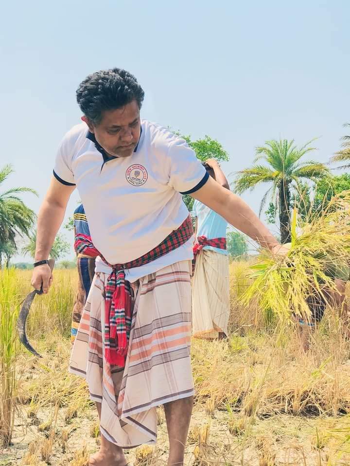 কৃষকের পাকা ধান কাটতে ফসলের েেত হাতে কাঁচি নিয়ে হাজির হলেন তিনি।