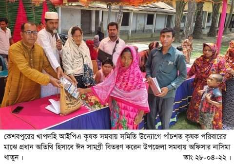 কেশবপুর উপজেলার খোপদহি আইপিএ কৃষক সমবায় সমিতি লিমিটেডের পক্ষ থেকে সমিতির সদস্য পাঁচশত কৃষক পরিবারের মাঝে পবিত্র ঈদুল ফিতর উপলক্ষে ঈদ সামগ্রী বিতরণ করা হয়েছে। সমিতির পরিচালক সাজ্জাত হুসাইনের সভাপতিত্বে ও সম্পাদক আসাদুজ্জামান এর পরিচালনায় ২৭ এপ্রিল সকালে ভান্ডারখোলা দাখিল মাদ্রাসা ময়দানে ঈদ সামগ্রী বিতরণ অনুষ্ঠানে প্রধান অতিথির বক্তব্য রাখেন উপজেলা সমবায় অফিসার নাসিমা খাতুন। বিশেষ অতিথির বক্তব্য রাখেন কেশবপুর উপজেলা প্রেসক্লাবের সভাপতি এস আর সাঈদ। অন্যান্যের মধ্যে বক্তব্য রাখেন সমিতির প্রধান উপদেষ্টা উপ-সহকারী কৃষি অফিসার হাসানুর রহমান, উপদেষ্টা মাস্টার রফিকুল ইসলাম, মফিজুর রহমান, সমিতির ভারপ্রাপ্ত ম্যানেজার আব্দুল্লাহ আল মামুন, ইউপি সদস্য জি এম জুলফিকার আলী জুলু, মাস্টার হাফিজুর রহমান, কার্যনির্বাহী কমিটির সদস্য মোস্তফা কামাল প্রমুখ।