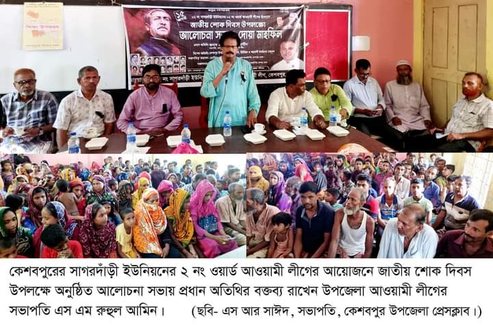 জাতির জনক বঙ্গবন্ধু শেখ মুজিবুর রহমানের ৪৮ তম শাহাদাৎ বার্ষিকী ও জাতীয় শোক দিবস পালন উপলক্ষে ১৯ আগস্ট বিকালে কেশবপুর উপজেলার সাগরদাঁড়ী ইউনিয়নের ১, ২, ৪ ও ৫ নং ওয়ার্ড আওয়ামী লীগের আয়োজনে পৃথক পৃথক ভাবে পালিত হয়েছে। যশোর-৬ কেশবপুর সংসদীয় আসনের সংসদ সদস্য ও যশোর জেলা আওয়ামী লীগের সাধারণ সম্পাদক শাহীন চাকলাদার কেশবপুর উপজেলার ১০৮ টি ওয়ার্ডে জাতীয় শোক দিবসের কর্মসূচী পালনের জন্য ৫ হাজার কেজি চাউল ও নগদ ৬ লাখ টাকা প্রদান করেছেন। সাগরদাঁড়ী ইউনিয়নের ২ নং ওয়ার্ড আওয়ামী লীগের সভাপতি মোমিন মোড়লের সভাপতিত্বে ও সাধারণ সম্পাদক আব্দুল মজিদ গাজীর সঞ্চালনায় মেহেরপুর সরকারী প্রাথমিক বিদ্যালয়ের সভাকক্ষে অনুষ্ঠিত আলোচনা সভা ও দোয়া মাহফিলের প্রধান অতিথির বক্তব্য রাখেন উপজেলা আওয়ামী লীগের সভাপতি এস এম রুহুল আমিন। বিশেষ অতিথির বক্তব্য রাখেন যশোর জেলা আওয়ামী লীগের সদস্য পৌর মেয়র রফিকুল ইসলাম, উপজেলা আওয়ামী লীগের সাংগঠনিক সম্পাদক গৌতম রায়, দপ্তর সম্পাদক মফিজুর রহমান মফিজ, সহ- দপ্তর সম্পাদক মনোজ তরফদার, কোষাধ্যক্ষ স্বপন কুমার মুখার্জী, শিক্ষা ও মানব সম্পাদ বিষয়ক সম্পাদক মহিবুর রশিদ, কেশবপুর উপজেলা প্রেসক্লাবর সভাপতি এস আর সাঈদ, উপজেলা জাতীয় শ্রমিকলীগের আহ্বায়ক সরদার মুনছুর আলী, সাগরদাঁড়ী ইউনিয়ন আওয়ামী লীগের আহ্বায়ক রফিকুল ইসলাম সরদার, যুগ্ম-আহ্বায়ক ওলিয়ার রহমান, যুগ্ম-আহ্বায়ক মাষ্টার জাফর ইকবাল, যুগ্ম-আহ্বায়ক আব্দুল আলিম, পৌর আওয়ামী লীগনেতা আমানুর রহমান খান ও সাগরদাঁড়ী ইউনিয়ন যুবলীগের আহ্বায়ক কাজী আলমগীর।