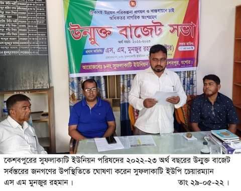কেশবপুর উপজেলার সুফলাকাটি ইউনিয়ন পরিষদের ২০২২-২৩ অর্থবছরের উন্মুক্ত বাজেট সর্বস্তরের জনগণের উপস্থিতিতে ঘোষণা করা হয়েছে।