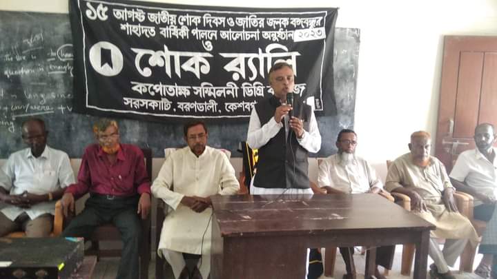 হাজার বছরের শ্রেষ্ঠ বাঙালি জাতির জনক বঙ্গবন্ধু শেখ মুজিবুর রহমানের ৪৮ তম শাহাদাৎ বার্ষিকী ও জাতীয় শোক দিবস পালন উপলক্ষে ২১ আগস্ট সোমবার সকাল থেকে দুপুর পর্যন্ত কেশবপুর উপজেলার ১ নং ত্রিমোহিনী ইউনিয়নের সরসকাটি বরণডালী অবস্থিত কপোতাক্ষ সম্মিলনী ডিগ্রী কলেজের শিক্ষক, ছাত্র ছাত্রী, অভিভাবক সহ এলাকার বিভিন্ন ওয়ার্ড আওয়ামী লীগের সভাপতি, সম্পাদক ও সাধারণ মানুষের উপস্থিতিতে আলোচনা সভা, দোয়া ও স্মরণসভা অনুষ্ঠিত হয়। সভায় প্রধান অতিথি হিসেবে বক্তব্য রাখেন,আগামী জাতীয় সংসদ নির্বাচনে আওয়ামী লীগের দলীয় মনোনয়ন প্রত্যাশী কেশবপুর উপজেলা আওয়ামী লীগের আইন বিষয়ক সম্পাদক ব্যারিস্টার হুসাইন মোহাম্মদ ইসলাম। এসময় উপস্থিত ছিলেন ডিগ্রী কলেজের শিক্ষক,শিক্ষার্থী,অভিবায়ক সহ ইউনিয়ন আওয়ামী লীগের সহযোগী সংগঠনের নেতা-কর্মী।