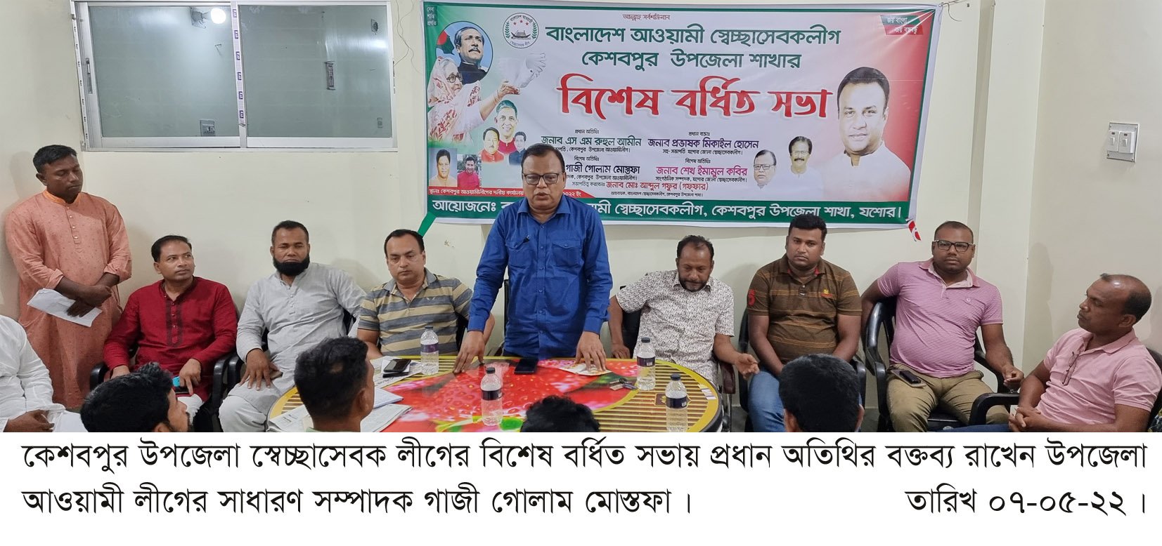 কেশবপুর উপজেলা স্বেচ্ছাসেবক লীগের আহ্বায়ক আব্দুল গফুর গফ্ফারের সভাপতিত্বে ও স্বেচ্ছাসেবক লীগনেতা আব্দুর রাজ্জাকের সঞ্চালনায় অনুষ্ঠিত বিশেষ বর্ধিত সভায় প্রধান অতিথির বক্তব্য রাখেন উপজেলা আওয়ামী লীগের সাধারণ সম্পাদক গাজী গোলাম মোস্তফা। বিশেষ অতিথির বক্তব্য রাখেন যশোর জেলা স্বেচ্ছাসেবক লীগের সহ-সভাপতি প্রভাষক মিকাইল হোসেন ও সাংগঠনিক সম্পাদক শেখ ইমামূল কবির। অন্যান্যের মধ্যে বক্তব্য রাখেন উপজেলা স্বেচ্ছাসেবক লীগের যুগ্ম-আহ্বায়ক বি এম ইব্রাহীম হোসেন, যুগ্ম-আহ্বায়ক তরিকুল ইসলাম, সদস্য হাদিউজ্জামান জয়, পৌর স্বেচ্ছাসেবক লীগের আহ্বায়ক আবুল বাসার খান, মজিদপুর ইউনিয়ন স্বেচ্ছাসেবক লীগের আহ্বায়ক রামপ্রসাদ দেবনাথ, গৌরীঘোনা ইউনিয়ন স্বেচ্ছাসেবক লীগের সভাপতি এস এম আসাদুজ্জামান আসাদ, সাধারণ সম্পাদক রাকিবুল হাসান মোড়ল, সুফলাকাটি ইউনিয়ন স্বেচ্ছাসেবক লীগের সভাপতি আলী আহসান মিন্টু, পাঁজিয়া ইউনিয়ন স্বেচ্ছাসেবক লীগের আহ্বায়ক সাজ্জাত হোসেন, মঙ্গলকোট ইউনিয়ন স্বেচ্ছাসেবক লীগের যুগ্ম-আহ্বায়ক শেখ আসাদুজ্জামান আসাদ, হাসানপুর ইউনিয়ন স্বেচ্ছাসেবক লীগের আহ্বায়ক মুক্তাদুর রহমান পিপলু প্রমুখ। বিশেষ বর্ধিত সভায় আগামী ১৩ মে উপজেলা স্বেচ্ছাসেবক লীগের ত্রি-বার্ষিক সম্মেলর সফল করতে ব্যাপক প্রস্তুতি গ্রহণ করা হয়।
