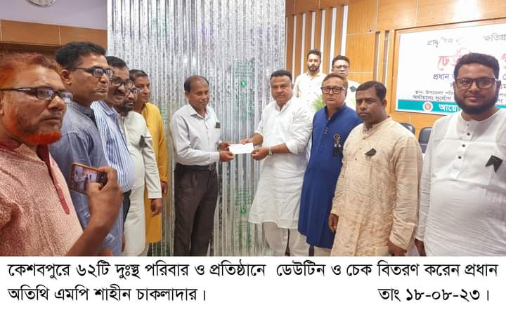 কেশবপুর উপজেলা প্রশাসনের আয়োজনে দূর্যোগ ব্যবস্থাপনা ও ত্রাণ মন্ত্রনালয়ের অর্থায়নে এবং দূর্যোগ ব্যবস্থাপনা অধিদপ্তরের বাস্তবায়নে প্রকৃতিক দূর্যোগে ক্ষতিগ্রস্থ অসহায় দুঃস্থ ব্যাক্তি ও প্রতিষ্ঠানের মাঝে বিনামূল্যে ডেউটিন ও গৃহ মঞ্জুরি বাবদ চেক বিতরণ করা হয়েছে। উপজেলা নির্বাহী অফিসার এম এম আরাফাত হোসেনের সভাপতিত্বে শুক্রবার বিকালে উপজেলা পরিষদ হল রুমে প্রধান অতিথি হিসাবে ৬২টি দুঃস্থ পরিবার ও প্রতিষ্ঠানে ১ শত ৩৩ বান ঢেউটিন এবং ৩ লাখ ৯৯ হাজার টাকা বিতরণ করেন এমপি শাহীন চাকলাদার। এসময় অন্যান্যের মধ্যে উপস্থিত ছিলেন যশোর জেলা আওয়ামী লীগের সদস্য পৌর মেয়র রফিকুল ইসলাম, উপজেলা আওয়ামী লীগের দপ্তর সম্পাদক মফিজুর রহমান মফিজ, সহ দপ্তর সম্পাদক মনোজ তরফদার, কেশবপুর উপজেলা প্রেসক্লাবের সভাপতি এস আর সাঈদ, পাঁজিয়া ইউনিয়ন আওয়ামী লীগের সভাপতি সাবেক চেয়ারম্যান শফিকুল ইসলাম মুকুল, সাধারণ সম্পাদক আব্দুল আহাদ আল বাহার, গৌরীঘোনা ইউপি চেয়ারম্যান এস এম হাবিবুর রহমান হাবিব, বিদ্যানন্দকাটি ইউপি চেয়ারম্যান আমজাদ হোসেন, পাঁজিয়া ইউপি চেয়ারম্যান জসীম উদ্দীন, কেশবপুর সদর ইউনিয়ন আওয়ামী লীগের সাধারণ সম্পাদক কবির হোসেন, সুফলাকাটি ইউনিয়ন আওয়ামী লীগের সাধারণ সম্পাদক গোলাম কিবরিয়া মনি, বিদ্যানন্দকাটি ইউনিয়ন আওয়ামী লীগের যুগ্ম-আহ্বায়ক রফিকুল ইসলাম, সাতবাড়ীয়া ইউনিয়ন আওয়ামী লীগের যুগ্ম-আহ্বায়ক সামসুন্নাহার লিলি, যুগ্ম-আহ্বায়ক আবু বক্কার সিদ্দিক, কাটাখালি মাধ্যমিক বিদ্যালয়ের প্রধান শিক্ষক মলয় কুমার ব্রম্ম, বড়েঙ্গা সম্মিলনী বিদ্যাপিঠের প্রধান শিক্ষক মধুসূদন, মূলগ্রাম মাধ্যমিক বালিকা বিদ্যালয়ের প্রধান শিক্ষক সঞ্জয় কুমার মন্ডল প্রমুখ।