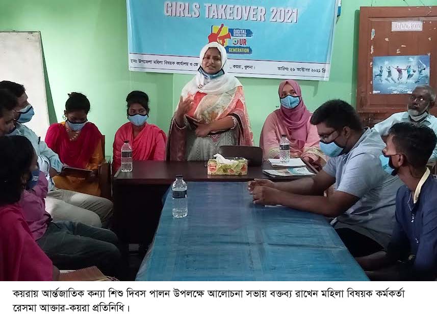 কয়রা শাকবাড়ীর স্কুল এন্ড কলেজের নবম শ্রেণীর ছাত্রী ও কয়রা উপজেলা এনসিটিএফের সভাপতি শিউলী মুন্ডা ২৬ অক্টােবর সকাল ১০ টায় কয়রা উপজেলা মহিলা বিষয়ক কার্যালয়ের হলরুমে পরিত্রাণের উদ্যােগে ও প্লান ইটারন্যাশনালের ও সুইডেন সিডার আর্থিক সহযাগিতায় আন্তর্জাতিক কন্যা শিশু দিবস এর গালসের টেকওভার পালন উপলক্ষে কয়রা উপজেলা মহিলা বিষয়ক কর্মকর্তা রেশমা আক্তার প্রতীকি দায়িত্ব প্রদান করেন শিউলী মুন্ডাকে। নতুন দায়িত্ব বুঝে নিয়েই মহিলা বিষয়ক অধিদপ্তরের অধিন বিভিন্ন কার্যক্রম দেখেন। উপজেলা পর্যায়ে মহিলাদের জন্য আয়বর্ধক (আই জিএ) প্রশিক্ষণ প্রকল্প পরিদর্শন করেন। পরিদর্শন শেষে জেজেএস এর হলরুমে শৈব্যা মুন্ডার সভাপতিত্বে আন্তর্জাতিক কন্যা শিশু দিবস পালন উপলক্ষে আলােচনা সভায় নারীর ক্ষমতায়ন শিশুদের অধিকার আনায়নে নানা সুপারিশ করা হয়। পরিত্রাণের প্রজক্ট অফিসার আলাউদ্দিনের পরিচালনায় অনুষ্ঠানে বক্তব্য রাখেন কয়রা উপজেলা মহিলা বিষয়ক কর্মকতা রেশমা আক্তার, উপজেলা তথ্য বিষয়ক কর্মকতা ইসকিতা আফরিন, প্রসক্লাবের সাধারন সম্পদক রিয়াছাদ আলী, উপজেলা স্বাস্থ্য বিভাগর প্রতিনিধি এবি সিদ্দিকী, কয়রা শিশু অধিকার কােয়ালিশনের সভাপতি অধ্যাপক আ.ব.ম আঃ মালেক, আইসিডি পরিাচালক মােঃ আশিকুজ্জামান, সহকারী প্রধান শিক্ষক হেনা রানী সরকার, সিএসআরএলের ফিল্ড অফিসার নিরাপদ মুন্ডা, আদিবাসি সদস্য গনেশ মুন্ডা, নমিতা মুন্ডা প্রমুখ। অনুষ্ঠানে জনপ্রতিনিধি, সাংবাদিক, শিক্ষক, গ্রাম পুলিশ, এনজিও প্রতিনিধি সহ গন্যমান্য ব্যাক্তিবর্গ উপস্থিত ছিলেন।