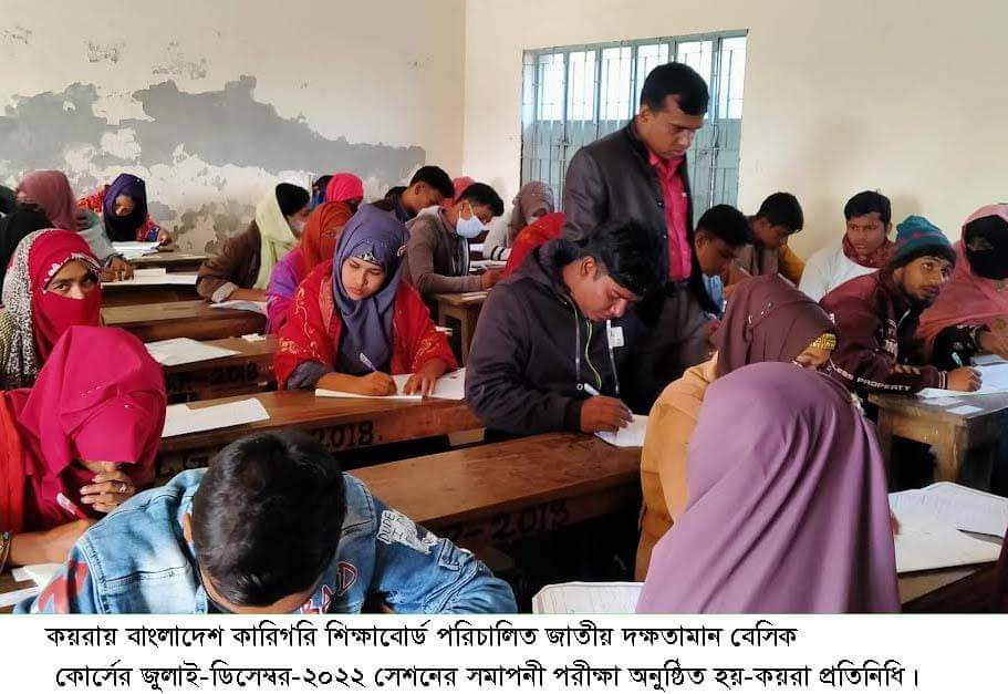 খুলনার কয়রায় বাংলাদেশ কারিগরী শিক্ষাবোর্ড পরিচালিত জাতীয় দক্ষতামান বেসিক ৩৬০ ঘন্টা মেয়াদী কোর্সের জুলাই-ডিসেম্বর-২০২২ সেশনের সমাপনী পরীক্ষা উপজেলা সদরের কয়রা কম্পিউটার ইনষ্টিটিউটে পরীক্ষা কেন্দ্র (৩৫১৬০) ও কয়রা মদিনাবাদ দাখিল মাদ্রাসা, কয়রা, খুলনা ভেন্যুতে ৬জানুয়ারী, শুক্রবার সকাল ১০ টায় পরীক্ষা শুরু হয়ে সুষ্ঠুভাবে সম্পন্ন হয়েছে।