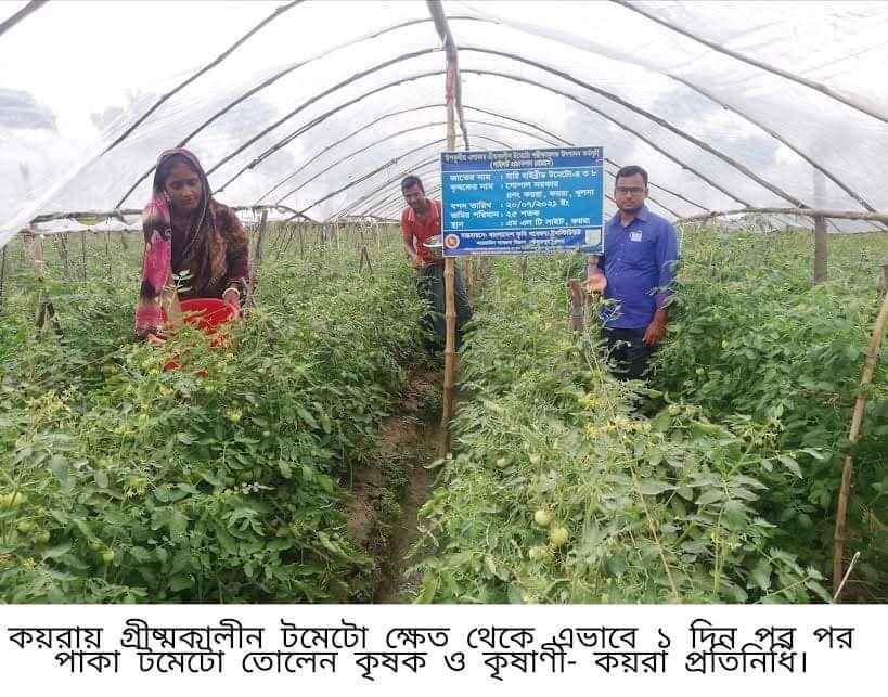 কৃষি বিপ্লবে যুক্ত হয়েছে উচ্চফলনশীল “গ্রীষ্মকালীন টমেটো’ বাংলাদেশ কৃষি গবেষণা ইনস্টিটিউট (বারি) উদ্ভাবিত উন্নতজাতের এই সব্জীকে সামার টমেটোও বলা হয়ে থাকে। তারই ধারাবহিকতায়, খুলনার কয়রা উপজেলায় সাদা পলিথিন ও বাঁশের ছাউনি দিয়ে শেড তৈরী করে আধুনিক প্রযুক্তিতে গ্রীষ্মকালীন টমেটো চাষ করে ঘুরে দাঁড়ানোর স্বপ্ন দেখছেন কৃষক গোপাল সরকার।