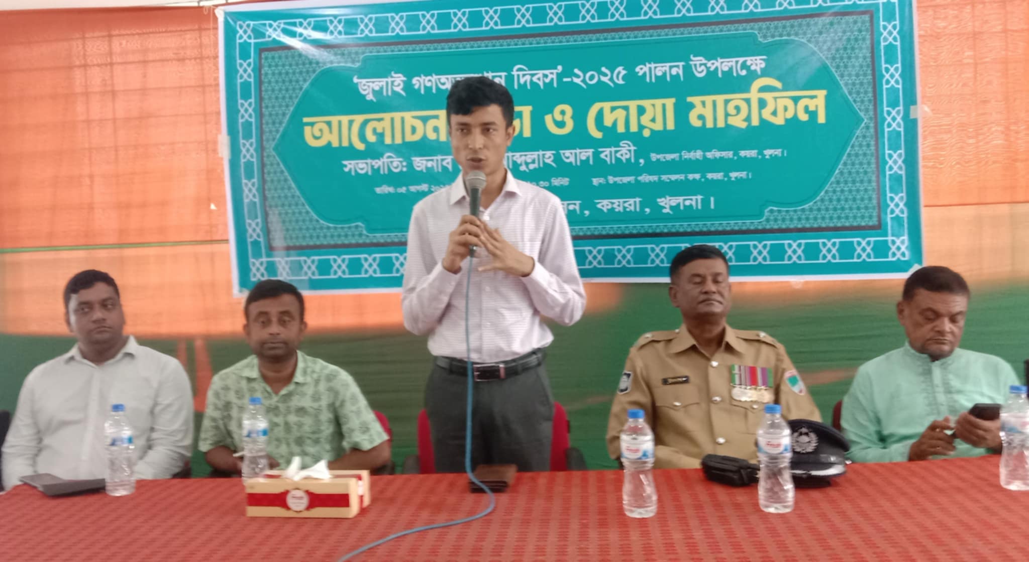 কয়রা উপজেলা প্রশাসনের উদ্যোগে জুলাই গনঅভ্যুত্থান দিবস পালন উপলক্ষে আলোচনা সভা ও দোয়া মাহফিল অনুষ্ঠিত হয়েছে।