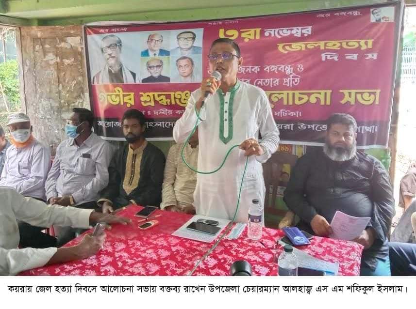 বাংলাদেশ আওয়ামী যুবলীগ কয়রা উপজেলা শাখার উদ্যােগে ৩ রা নভেম্বর জেল হত্যা দিবস পালন উপলক্ষে আলােচনা সভা বুধবার সকাল ১০ টায় দলীয় কার্যালয়ে অনুষ্ঠিত হয়।
