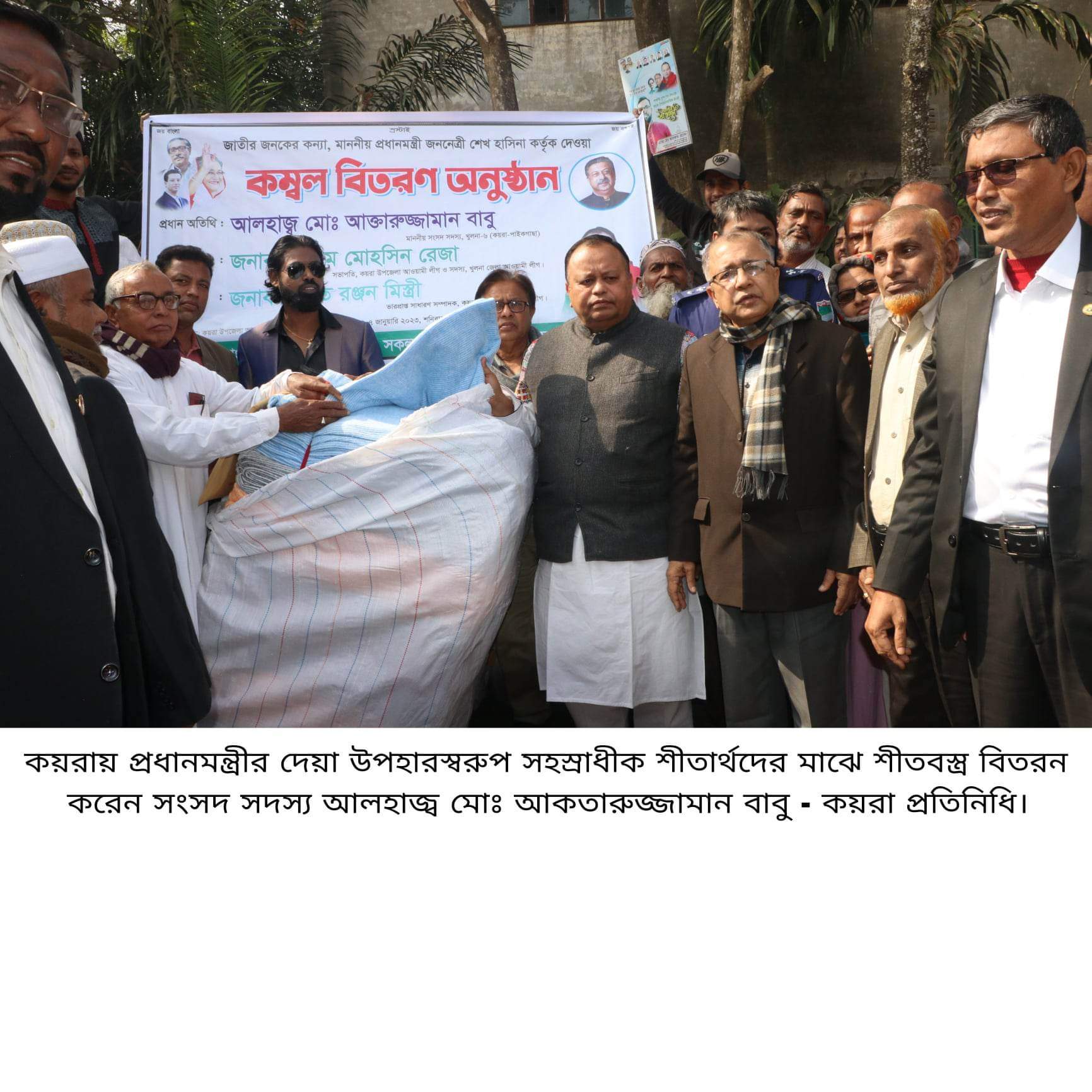 ৭ জানুয়ারী,শনিবার সকাল ১১ টায় কয়রা উপজেলা আওয়ামীলীগের সভাপতি জিএম মোহসিন রেজার সভাপতিত্বে উপজলা আওয়ামীলীগ ও সহযোগী সংগঠনের আয়াজনে দলীয় কার্যালয়ে প্রধান অতিথি হিসেবে দলীয় নেতাকর্মী সহ সহস্রাধিক শীতার্থদের মাঝে প্রধানমন্ত্রীর এ উপহার শীত বস্ত্র (কম্বল) বিতরণ করেন স্থানীয় সাংসদ আলহাজ্ব মোঃ আক্তারুজ্জামান বাবু। এসময় উপস্থিত ছিলেন, উপজেলা পরিষদ চেয়ারম্যান আলহাজ্ব এসএম শফিকুল ইসলাম, সাবেক মুক্তিযোদ্ধা কমান্ডার কেরামত আলী, আওয়ামীগের যুগ্ম সাধারন সম্পাদক জাফরুল ইসলাম পাড়, সাংগঠনিক সম্পাদক ও সদর ইউপি চেয়ারম্যান এসএম বাহারুল ইসলাম, ইউপি চেয়ারম্যান নুরুল ইসলাম কোম্পানি, ইউপি চয়ারম্যান আঃ সামাদ গাজী, ইউপি চেয়ারম্যান জিয়াউর রহমান জুয়েল, সমরেশ সরকার, গনেশ মন্ডল, জিয়াদ আলী, দেবদাস কুমার রায়, আঃ রশিদ, লুৎফর রহমান, উপজেলা ছাত্রলীগের সভাপতি শরিফুল ইসলাম টিংকু, সাধারণ সম্পাদক আমিনুল হক বাদল সহ সকল সহযোগী সংগঠনের নেতৃবৃন্দ।