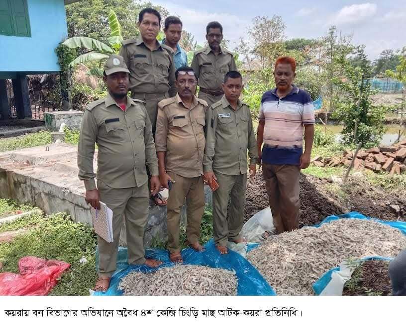 সুন্দরবন খুলনা রেঞ্জের অধিনস্থ কাশিয়াবাদ স্টেশন ও তার আওতাধীন টহল ফাঁড়ীর স্টাফরা বিশেষ অভিযান চালিয়ে ৪ শ কেজি বিশ প্রয়োগ করে মারা অবৈধ চিংড়ি মাছ আটক করার পাশাপাশি , ৩টি নৌকা, হরিণ ধরার সরঞ্জাম ও ফাঁদ, বরফসহ উদ্ধার করেছে। জানা গেছে, শনিবার রাত সাড়ে ১২ টার দিকে কাশিয়বাদ স্টেশন কর্মকর্তা মোঃ আখতারুজ্জামানের নেতৃত্বে অভিযান চালিয়ে কুলুখালীর ভারানী এলাকা থেকে ২ শ ৭০ কেজি বিষ প্রয়োগ করা চিংড়ি মাছ সহ ১টি নৌকা আটক করে। এ ছাড়া খুলনাগামি যাত্রিবাহী লঞ্চে অভিযান চালিয়ে ৬০ কেজি অপ্রদব্য মিশ্রিত চিংড়ি মাছ আটক করে। অন্যদিকে বজবজা বন টহল ফাঁড়ীর ভারপ্রাপ্ত কর্মকর্তা মোঃ তানজিলুর রহমানের নেতৃত্বে অভিযান চালিয়ে একই দিন রাত ১২ টার দিকে খড়কুড়ি নদীতে অভিযান চালিয়ে হরিণ ধরার ফাদ, ৪ টি চাকু, বরফ সহ হরিণ ধরার সরঞ্জাম, ১টি নৌকা আটক করে। এ সময় বন বিভাগের অভিযান জানতে পেরে হরিণ শিকারীরা পালিয়ে যেতে সক্ষম হয়। অপরদিকে ২ জুন রাত ১ টার দিকে খাশিটানা বন টহল ফাঁড়ীর ভারপ্রাপ্ত কর্মকর্তা মোঃ জাহাঙ্গীর হোসেনের নেতৃত্বে ছেড়ারমুখে অভিযান চালিয়ে ১ টি নৌকা সহ ৮৫ কেজি অবৈধ চিংড়ি মাছ আটক করা হয়েছে। আটককৃত চিংড়ি মাছ বিজ্ঞ কয়রা উপজেলা সিনিয়র জুডিশিয়াল ম্যাজিস্ট্রেট আদালতের নির্দেশক্রমে মাটিতে পুতে বিনষ্ট করা হয়েছে।