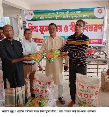 কয়রা উপজেলা কৃষি সম্প্রসারণ অধিদপ্তরের আয়ােজনে ২০২১-২২ রবি মৌসুমে কৃষি প্রনােদনার আওতায় ক্ষুদ্র ও প্রান্তিক কৃষকদের মাঝে বিনামূল্যে সার ও বীজ বিতরণ করা হয়েছে।