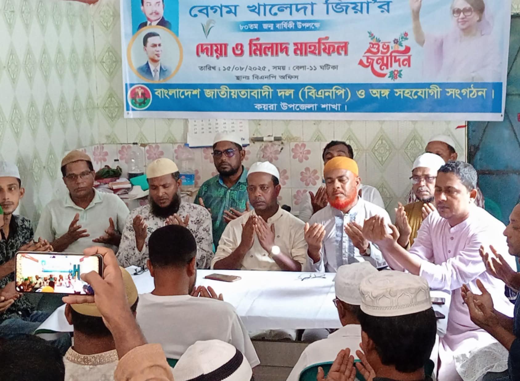 দোয়া মাহফিল পরিচালনা করেন মাওলানা ফারুক হুসাইন। অনুষ্ঠানে কয়রা উপজেলা বিএনপি ও অঙ্গ সহযোগী সংগঠনের নেতা কর্মীরা উপস্থিত ছিলেন।
