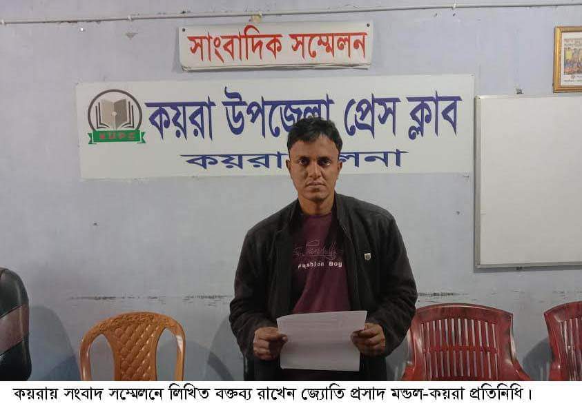 কয়রায় সংখ্যালঘু সম্প্রদায়ের মৎস্য ঘেরে ক্ষতি করা ও জবর দখল করার চেষ্টার প্রতিবাদ জানিয়ে সংবাদ সম্মেলন করেছেন উপজেলার দক্ষিণ বেদকাশী ইউনিয়নের বিনাপানি গ্রামের মৃত শিবনাথ মণ্ডলের পুত্র ও কয়রা উপজেলা যুব ঐক্য পরিষদের সহ-সভাপতি জ্যোতি প্রসাদ মণ্ডল।