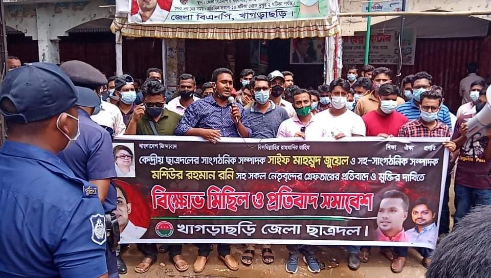 খাগড়াছড়িতে পুলিশের বাঁধায় কেন্দ্রীয় ছাত্রদলের সাংগঠনিক সম্পাদক সাইফ মাহমুদ জুয়েল ও সহ সাংগঠনিক সম্পাদক মশিউর রহমান রনি সহ সকল নেতৃবৃন্দের গ্রেফতারের প্রতিবাদ ও মুক্তির দাবীতে বিক্ষোভ সমাবেশ করেছে জেলা ছাত্রদল।
