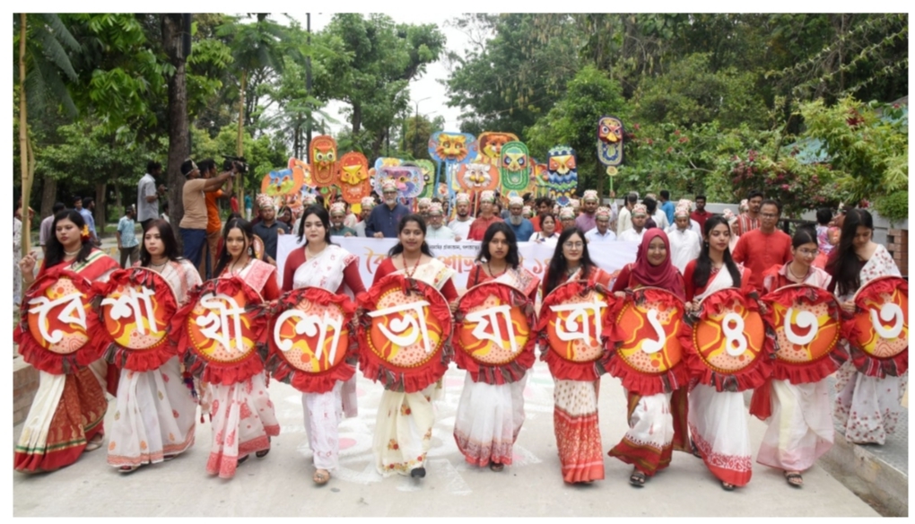 উদ্বোধনী অনুষ্ঠান শেষে শিক্ষক-শিক্ষার্থী, কর্মকর্তা-কর্মচারীদের স্বতঃস্ফূর্ত অংশগ্রহণে হাদী চত্বর থেকে বের হয় বর্ণাঢ্য শোভাযাত্রা। শোভাযাত্রাটি বিশ্ববিদ্যালয়ের প্রধান ফটক ঘুরে দ্বিতীয় ফটক দিয়ে প্রবেশ করে কেন্দ্রীয় মাঠে গিয়ে শেষ হয়। কাঠের তৈরি মোটিফ, মুখোশ, আল্পনা, ঢাক-ঢোলসহ নানা ঐতিহ্যবাহী অনুষঙ্গে সজ্জিত শোভাযাত্রাটি পুরো ক্যাম্পাসে ছড়িয়ে দেয় নববর্ষের রঙিন আবহ।