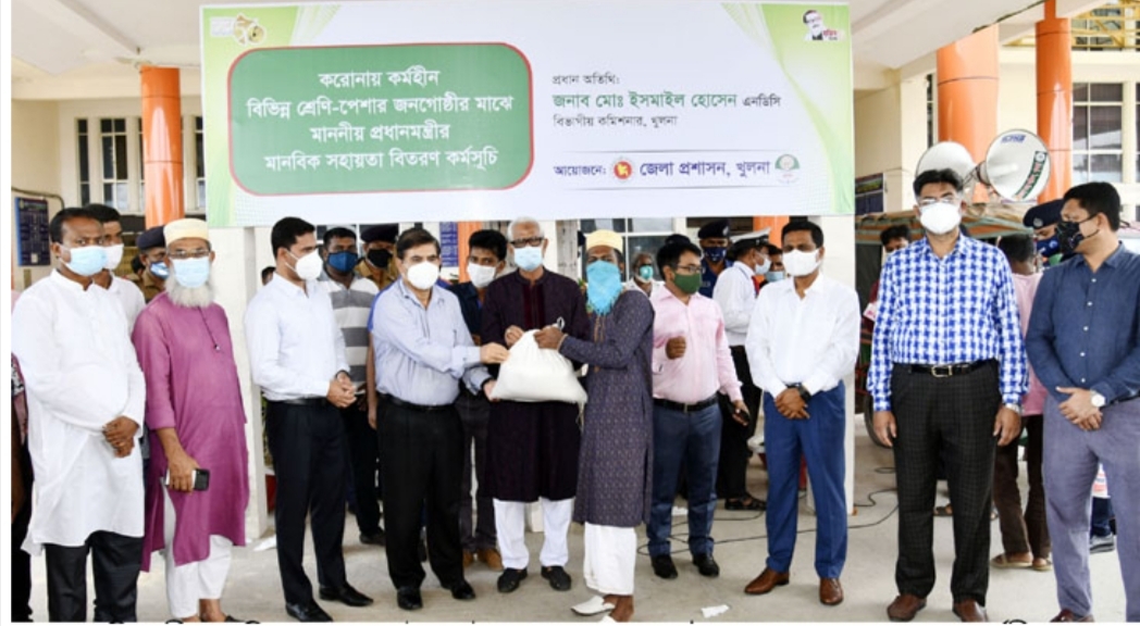 করোনাভাইরাস প্রতিরোধে চলমান কঠোর লকডাউনে খুলনায় কর্মহীন হয়ে পড়া দুইশত দোকান কর্মচারী, একশত নির্মাণ শ্রমিক, ২৭ জন প্রতিবন্ধী, ৩২ জন পাদুকা শ্রমিক, ৫০ ডেকোরেটর শ্রমিক, আট জন গৃহকর্মী এবং ৫০ জন হতদরিদ্র ব্যক্তির মাঝে প্রধানমন্ত্রীর মানবিক খাদ্যসহায়তা বিতরণ করা হয়। খাদ্য সহায়তার মধ্যে ছিলো সাত কেজি চাল, দুই কেজি আলু, ৫০০ গ্রাম ডাল, তৈল ৫০০ গ্রাম ও একটি সাবান।