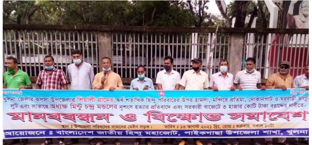 খুলনা জেলার রূপসা উপজেলার শিয়ালী গ্রামের অর্ধ শতাধিক হিন্দু পরিবারের উপর হামলা, মন্দিরে প্রতিমা, দোকানপাট ও ঘরবাড়ী ভাংচুর, লুট এবং সাভারে অধ্যক্ষ মিন্টু চন্দ্র মন্ডলের নৃশংশ হত্যার প্রতিবাদে এবং সরকারী বাজেটে ৩ হাজার কোটি টাকা বরাদ্দের দাবীতে মানববন্ধন ও বিক্ষোভ সমাবেশ অনুষ্ঠিত হয়েছে।