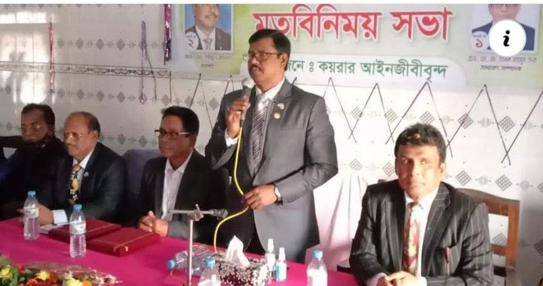 কয়রা উপজেলা আইনজীবি ইউনিট বারের সভাপতি এ্যাডঃ আবু জাফরের সভাপতিত্বে ও সাধারন সম্পাদক এ্যাডঃ গোলাম মোস্তফার পরিচালনায় মত বিনিময় সভায় প্রধান অতিথির বক্তব্য রাখেন, খুলনা জেলা আইনজীবি সমিতির সভাপতি এ্যাডঃ মোঃ সাইফুল ইসলাম।