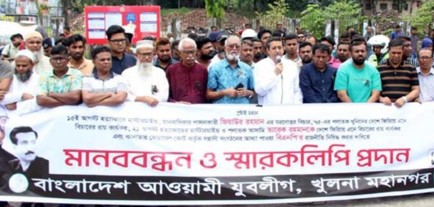 বৃহষ্পতিবার (০৩ আগস্ট) বেলা ১১টায় নগরীর শিববাড়ী মোড়ে নগর যুবলীগের সভাপতি সফিকুর রহমান পলাশের সভাপতিত্বে ও সাধারণ সম্পাদক শেখ শাহাজালাল হোসেন সুজনের পরিচালনায় অনুষ্ঠিত মানববন্ধনে বক্তব্য রাখেন খুলনা-০২ আসনের সংসদ সদস্য সেখ সালাহউদ্দিন জুয়েল এমপি।