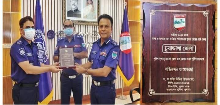 খুলনা রেঞ্জের সম্মানিত রেঞ্জ ডিআইজি ড. খঃ মহিদ উদ্দিন, বিপিএম(বার) মহোদয়ের নিকট হতে চুয়াডাঙ্গা জেলার সুযোগ্য পুলিশ সুপার জনাব মোঃ জাহিদুল ইসলাম শ্রেষ্ঠ জেলার পুরস্কার এবং চুয়াডাঙ্গা সদর থানায় কর্মরত এএসআই(নিঃ) মোঃ ইলিয়াস হোসাইন শ্রেষ্ঠ এএসআই হিসাবে পুরস্কার লাভ করেন। এ সময় পুলিশ সুপার মহোদয় রেঞ্জ ডিআইজি মহোদয়ের নিকট থেকে শ্রেষ্ঠ জেলার স্বীকৃতি পেয়ে সম্মানিত ইন্সপেক্টর জেনারেল ড. বেনজীর আহমেদ, বিপিএম(বার), খুলনা রেঞ্জ ডিআইজি ড. খঃ মহিদ উদ্দিন, বিপিএম(বার), চুয়াডাঙ্গা জেলার সকল পদমর্যাদার অফিসার- ফোর্সদের ধন্যবাদ ও কৃতজ্ঞতা প্রকাশ করেন।