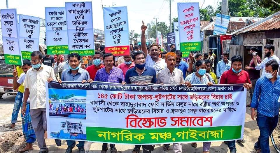 গাইবান্ধার বালাসীঘাট থেকে জামালপুরের বাহাদুরাবাদ ঘাট পর্যন্ত ফেরি সার্ভিস চালুর নামে সরকারের ১৪৫ কোটি টাকা অপচয় ও লুটপাটের সাথে জড়িতদের শাস্তির দাবিতে এক বিক্ষোভ সমাবেশ ও মানববন্ধন অনুষ্ঠিত হয়েছে।
