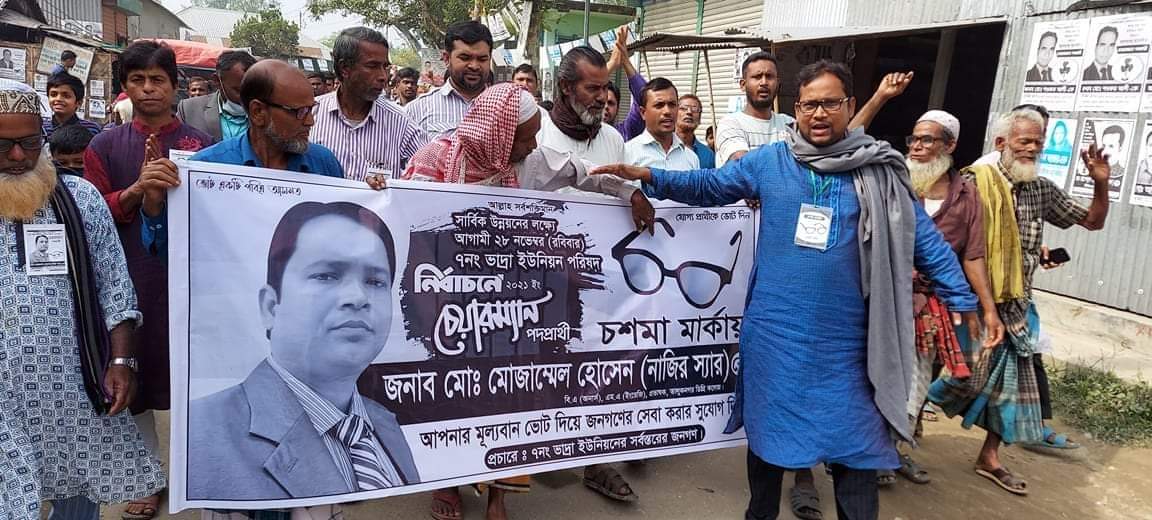 আসন্ন ইউপি নির্বাচনে ভাদ্রা ইউনিয়নে আমি চেয়ারম্যান পদে নির্বাচনে অংশগ্রহণ করছি।আমার প্রতীক চশমা।আমি ভোটারদের দুয়ারে দুয়ারে যাচ্ছি। জনগণ আমাকে ভোট দিয়ে নির্বাচিত করলে আগামীতে এলাকার রাস্তা ঘাটের উন্নয়ন,জনগনের নাগরিক সুবিধা প্রদান ও জনকল্যাণমুখী সকল কাজে এ ইউনিয়ন বাসীর পাশে থাকতে চাই।