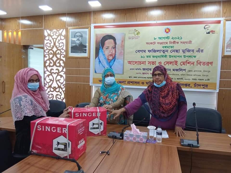 অনুষ্ঠানে মহিলা বিষয়ক অধিদপ্তরের ব্যবস্থাপনায় চাঁদপুরের সকল উপজেলায় ৫৬টি সেলাই মেশিন ও নগদ ২ হাজার করে টাকা অসহায় ও কর্মঠ ও সেলাই কাজে দক্ষতা আছে এমন নারীদেের প্রদান করা হয়েছে। জেলা প্রশাসক চাঁদপুর সদরের ও চাঁদপুর পৌরসভার ১০ কে এ সেলাই মেশিন প্রদান করেন। বাকীগুলো স্ব স্ব উপজেলায় প্রদানের নির্দেশ প্রদান করেন।