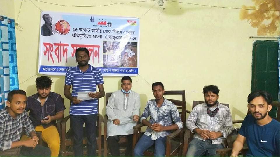 ১৫ আগস্ট জাতীয় শোক দিবসে নোয়াখালীর চাটখিলে বঙ্গবন্ধুর প্রতিকৃতিতে ফুল দেওয়াকে কেন্দ্র করে ছাত্রলীগের দু’পক্ষের মধ্যে সংঘর্ষ ও পুষ্পস্তবক ভাঙচুরের ঘটনার প্রতিবাদ এবং সংঘর্ষকারীদের বিচারের দাবীতে সংবাদ সম্মেলন করেছে ছাত্রলীগের একাংশ।
