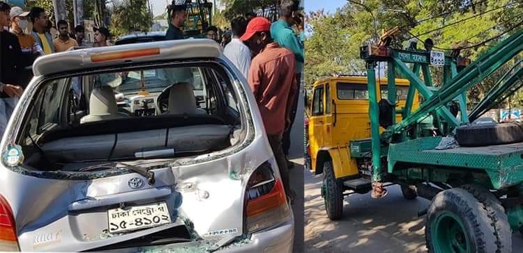 প্রত্যক্ষদর্শীরা জানান, কারটি (ঢাকা মেট্রো-গ ১৫-৪১০২) ড্রাইভ করছিলেন একজন নারী চিকিৎসক। তিনি শহীদ মিনারে ফুল দিয়ে বাচ্চাদের নিয়ে ফিরছিলেন। হঠাৎ চলন্ত কারের পিছন দিকে একটি রেকার (ঢাকা ই ৫৩৩) দ্রুত গতিতে এসে সজোরে ধাক্কা দেয় এতে প্রাইভেট কারের পিছনের গ্লাস চুর্ণ-বিচূর্ণ হয়ে দুমড়ে মুচড়ে যায়।