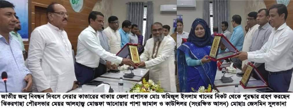 জাতীয় জন্ম নিবন্ধন দিবস ‘নির্ভুল জন্ম-মৃত্যু নিবন্ধন করব, শুদ্ধ তথ্যভাণ্ডার গড়ব’ এই স্লোগানকে সামনে রেখে যশোর জেলার সকল পৌরসভা ও ঝিকরগাছা উপজেলার সকল ইউনিয়নের মধ্যে আগস্ট-সেপ্টেম্বর/২২ জন্ম ও মৃত্যু নিবন্ধনে প্রথম স্থান অর্জন করেছে ঝিকরগাছা পৌরসভা। বৃহস্পতিবার সকালে যশোর জেলা প্রশাসকের কার্যালয় থেকে জেলা প্রশাসক মোঃ তমিজুল ইসলাম খাঁনের নিকট থেকে পুরষ্কার গ্রহণ করছেন ঝিকরগাছা পৌরসভার মেয়র আলহাজ্ব মোস্তফা আনোয়ার পাশা জামাল। এছাড়াও সকল উপজেলা ও সকল পৌরসভার ওয়ার্ড ভিত্তিক জন্ম-মৃত্যু নিবন্ধনে শ্রেষ্ঠত্ব অর্জন করায় জেলা প্রশাসক মোঃ তমিজুল ইসলাম খানের নিকট থেকে পুরষ্কার গ্রহণ করছেন ঝিকরগাছা পৌরসভার ৪,৫ ও ৬নং ওয়ার্ড কাউন্সিলর (সংরক্ষিত আসন) মোছাঃ জেসমিন সুলতানা। এসময় উপস্থিত ছিলেন জেলার স্থানীয় সরকার বিভাগের উপ-পরিচালক (উপ-সচিব) হুসাইন শওকত সহ জেলা প্রশাসকের কার্যালয়ের অন্যান্য নেতৃবৃন্দ।