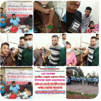 আজ ২রা নভেম্বর জাতীয় রক্তদান দিবস উপলক্ষে সেইফ ব্লাড ডোনেট সোসাইটি বিভিন্ন কর্মসূচি হাতে নিয়ে কাজ করেন তার মধ্যে ফ্রী রক্তের গ্রুপ নির্ণয় কর্মসূচি পালিত হয় ও ফ্রী রক্তদান কর্মসূচি পালিত হয়।